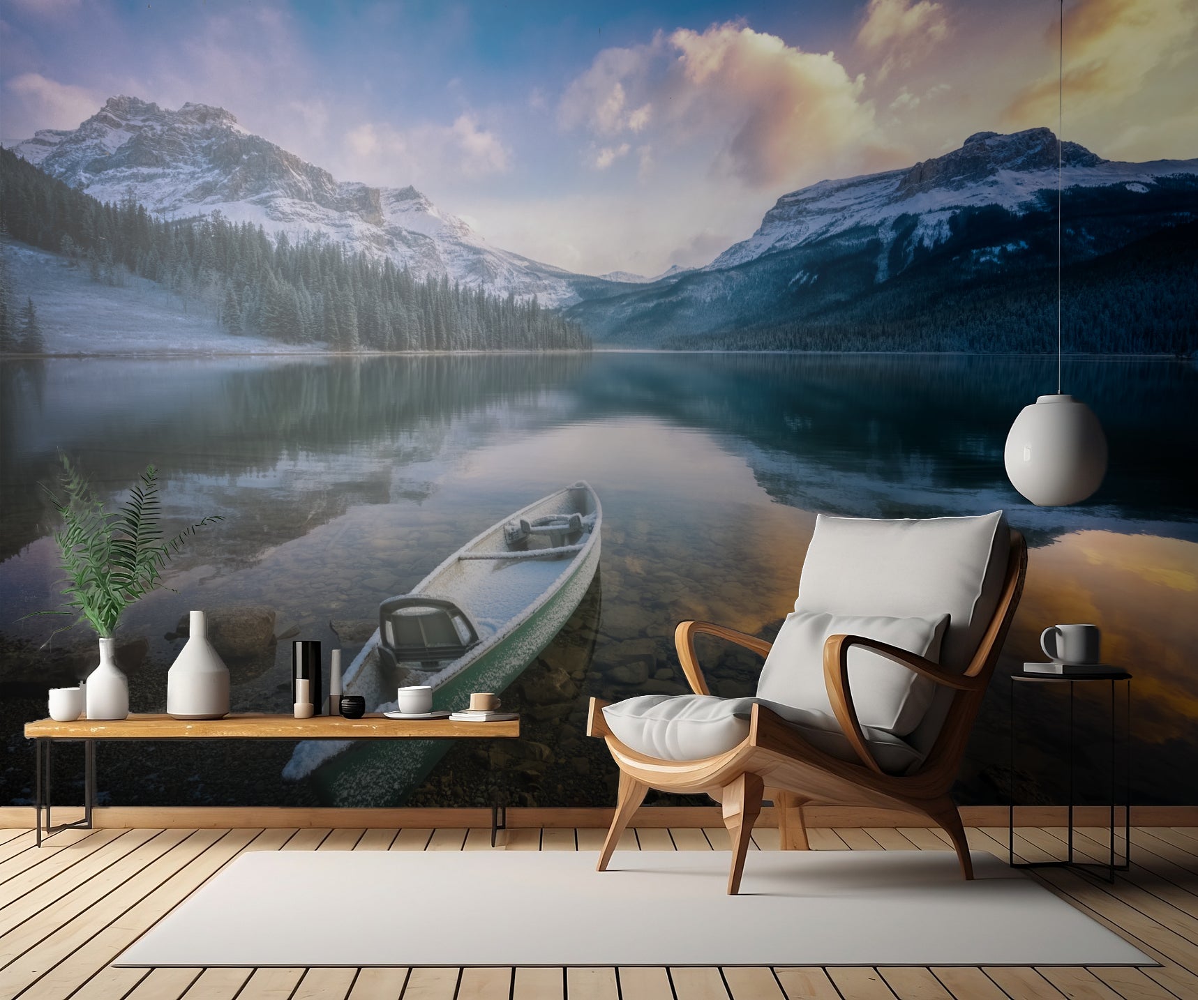 Med sin imponerande bild av det frostiga landskapet vid sjön förtrollar tapeten betraktaren och skapar en atmosfär av lugn och harmoni. Båtarna som ligger stilla på vattnet ger en känsla av stillhet och avkoppling, medan bergen och träden speglas i det klara vattnet. "First Snow Emerald Lake" för tankarna till en vacker vinterdag, då allt är täckt av ett tunt lager av frost och snö.