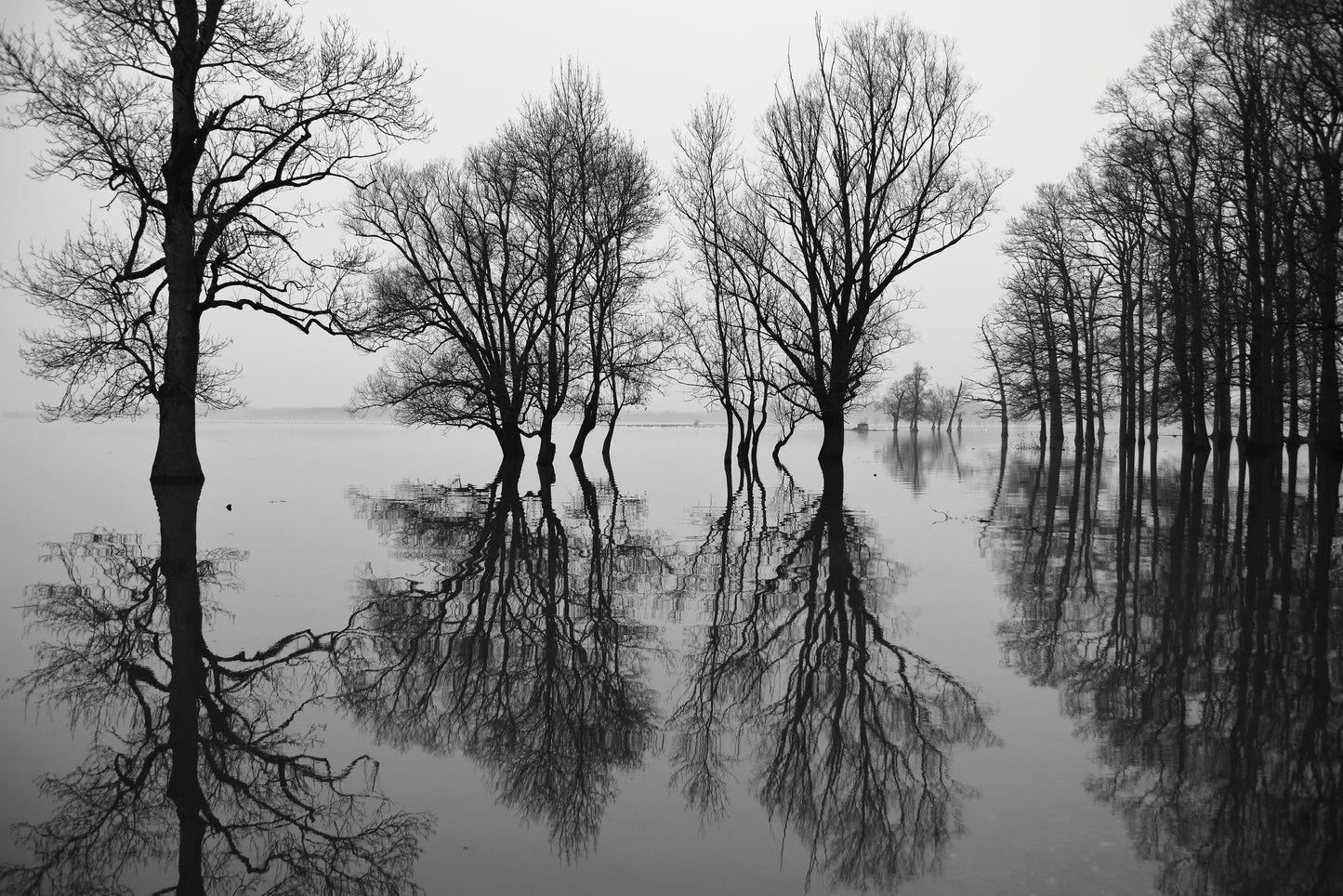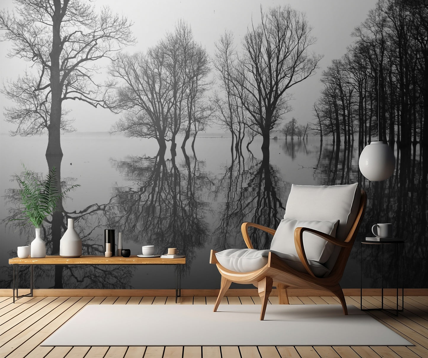 Tapetens huvudsakliga motiv är en översvämmad skog, där vattnet och träden smälter samman i en enastående reflektion. Genom att använda färgerna svart och vitt framträder detaljer och kontraster på ett spännande sätt, vilket gör att motivet kommer till liv på väggen.