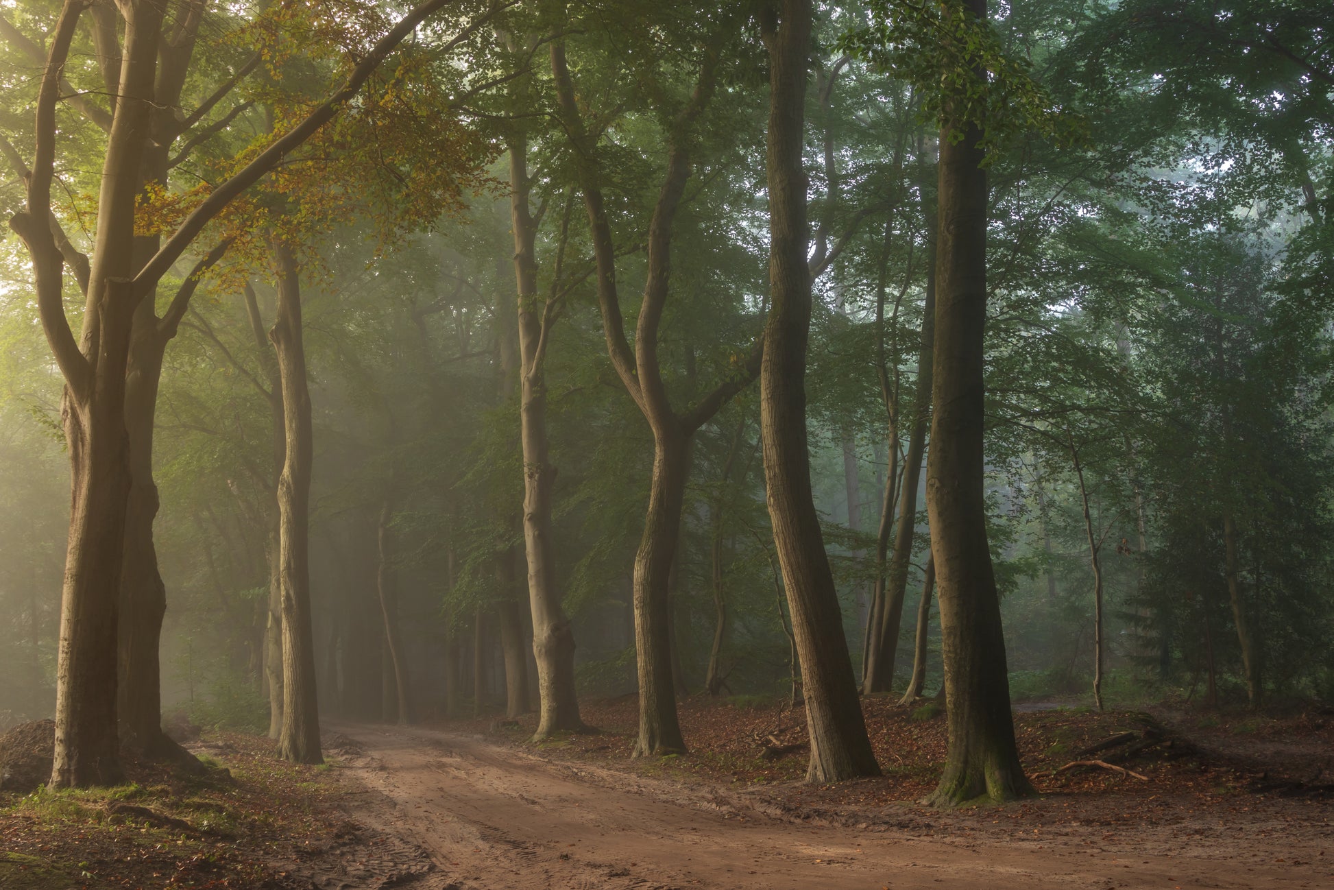 Den dimmiga skogen skapar en drömsk känsla, som att gå genom skogen en förtrollad morgon. Tree trunks, löv och en stig som leder blicken in i bilden är alla detaljer som ger tapeten en autentisk känsla av att vara ute i naturen. Den kalla atmosfären och det mjuka ljuset för tankarna till en stilla höstdag.