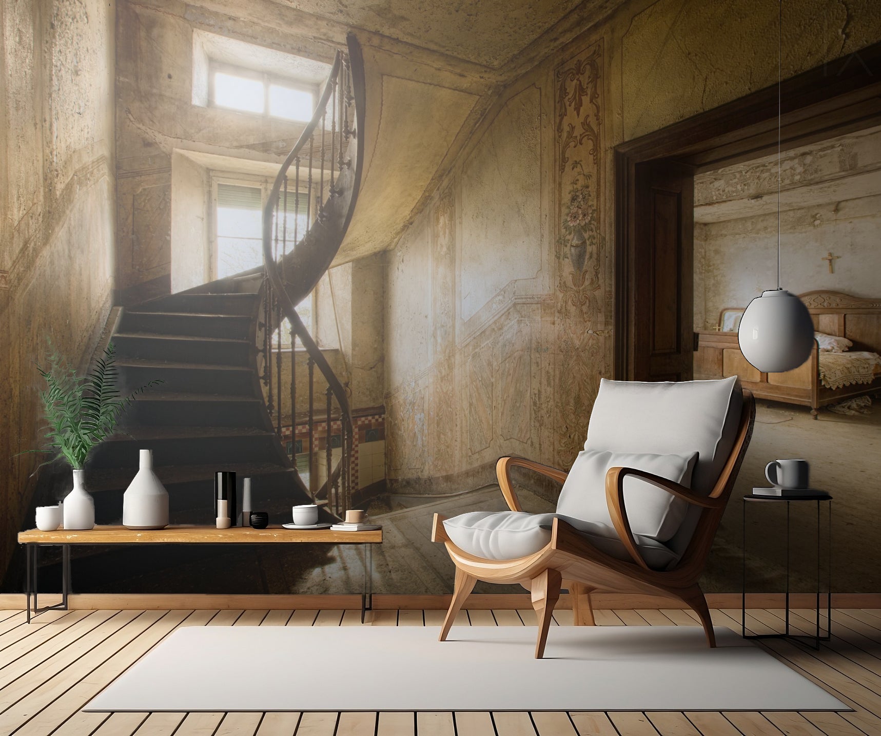 Skapa en spännande och mystisk atmosfär i ditt hem med väggtapeten "" av Paul Boomsma. Med motiv av förbisedda och förfallna trappor, rum och dörröppningar ger denna tapet en känsla av utforskning och upptäckt. Den gamla och förfallna miljön för tankarna till en glömd plats, vilket ger rummet en unik och karaktärsfull touch. De varma färgerna och den spiralformade designen ger en känsla av mystik och underverk, perfekt för att skapa en inbjudande och fascinerande atmosfär i sovrummet eller vardagsrummet.