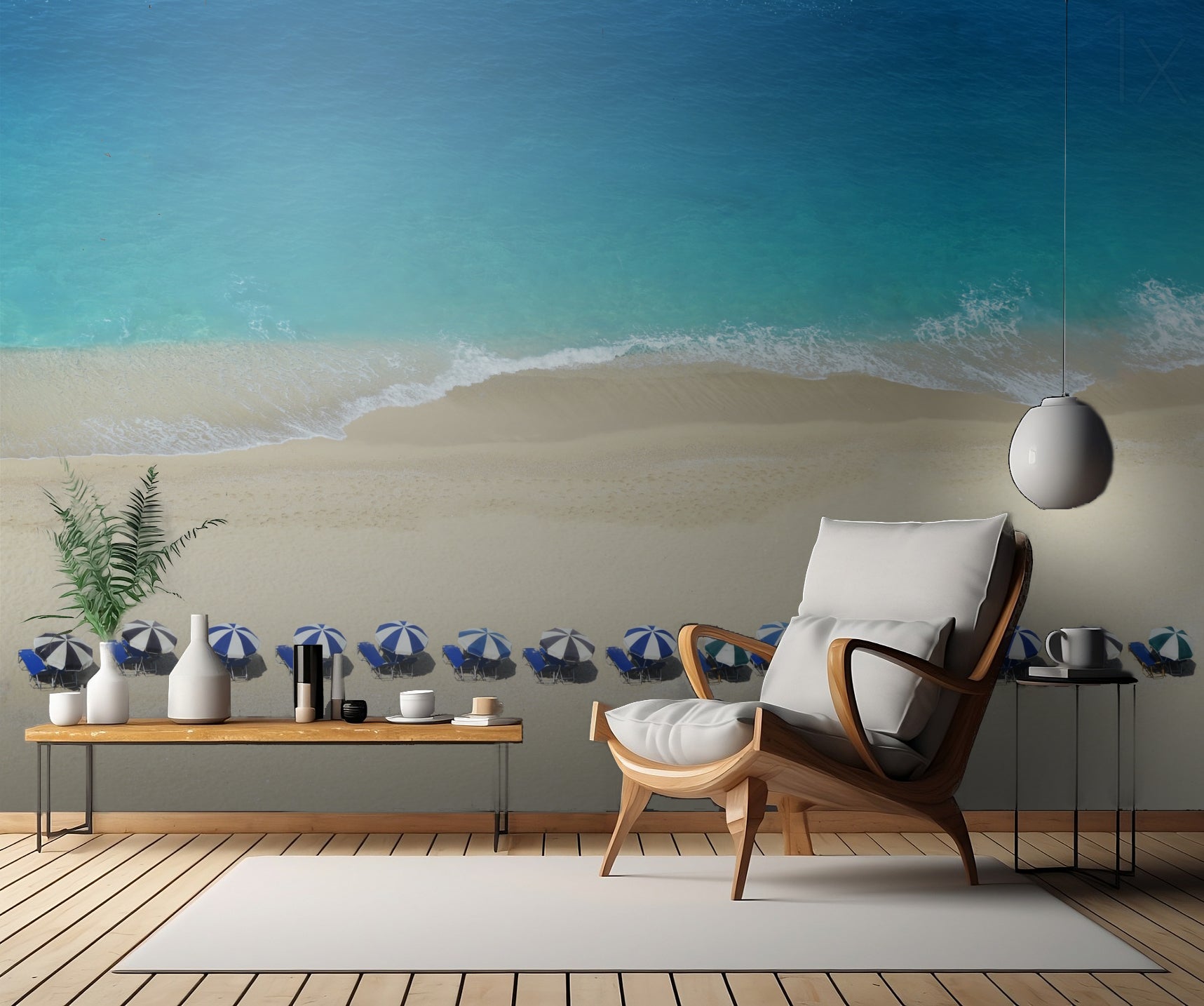 Skapa din egen lilla paradisstrand hemma med denna otroligt vackra väggtapet med motiv av strand, hav och sol! Med inspirerande illustrationer av parasoller, solbadande människor, och kristallklart havsvatten är denna tapet perfekt för att skapa en avslappnad och semesterliknande atmosfär i ditt hem.