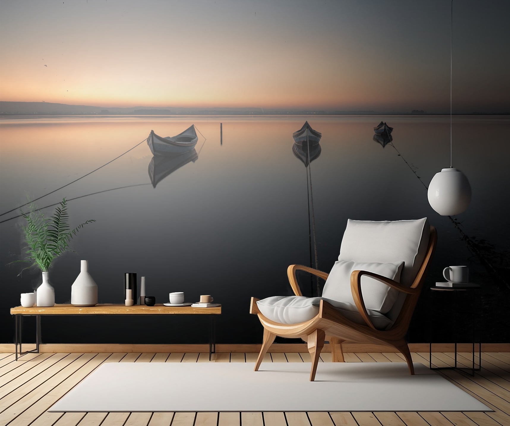 Det spektakulära vattenperspektivet med en rad båtar och rep ger en djupverkan som tar dina tankar till rofyllda sjöar. Den lilla roddbåten på tapeten är som en poetisk skildring av en stilla kväll, där vattenytan blir en spegelbild av lugn och frid.