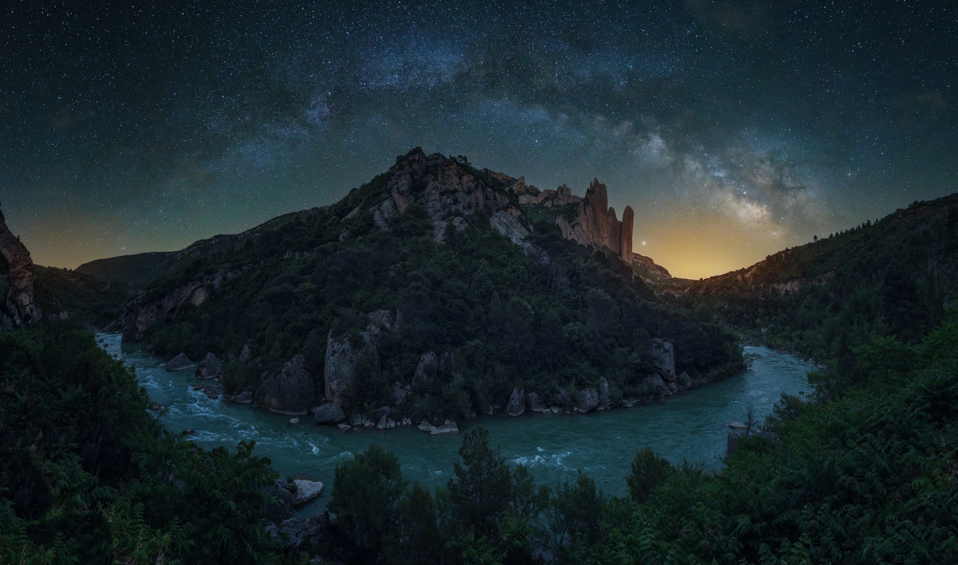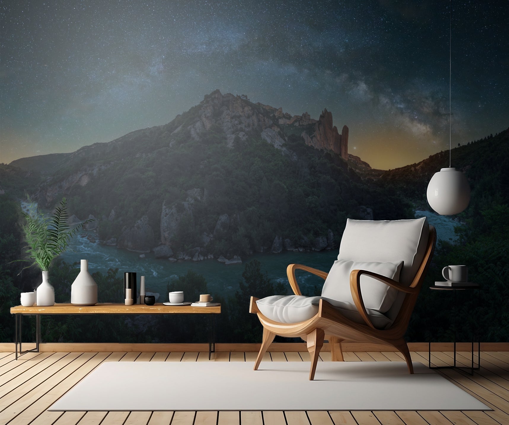 Landskapet på tapeten fångar en lugn och mystisk flod omgiven av träd. När natten faller över, blir himlen till ett fantastiskt skådespel av stjärnor, med Vintergatan som smyger sig över horisonten. Det är som att titta upp mot universum från bekvämligheten av ditt eget rum.