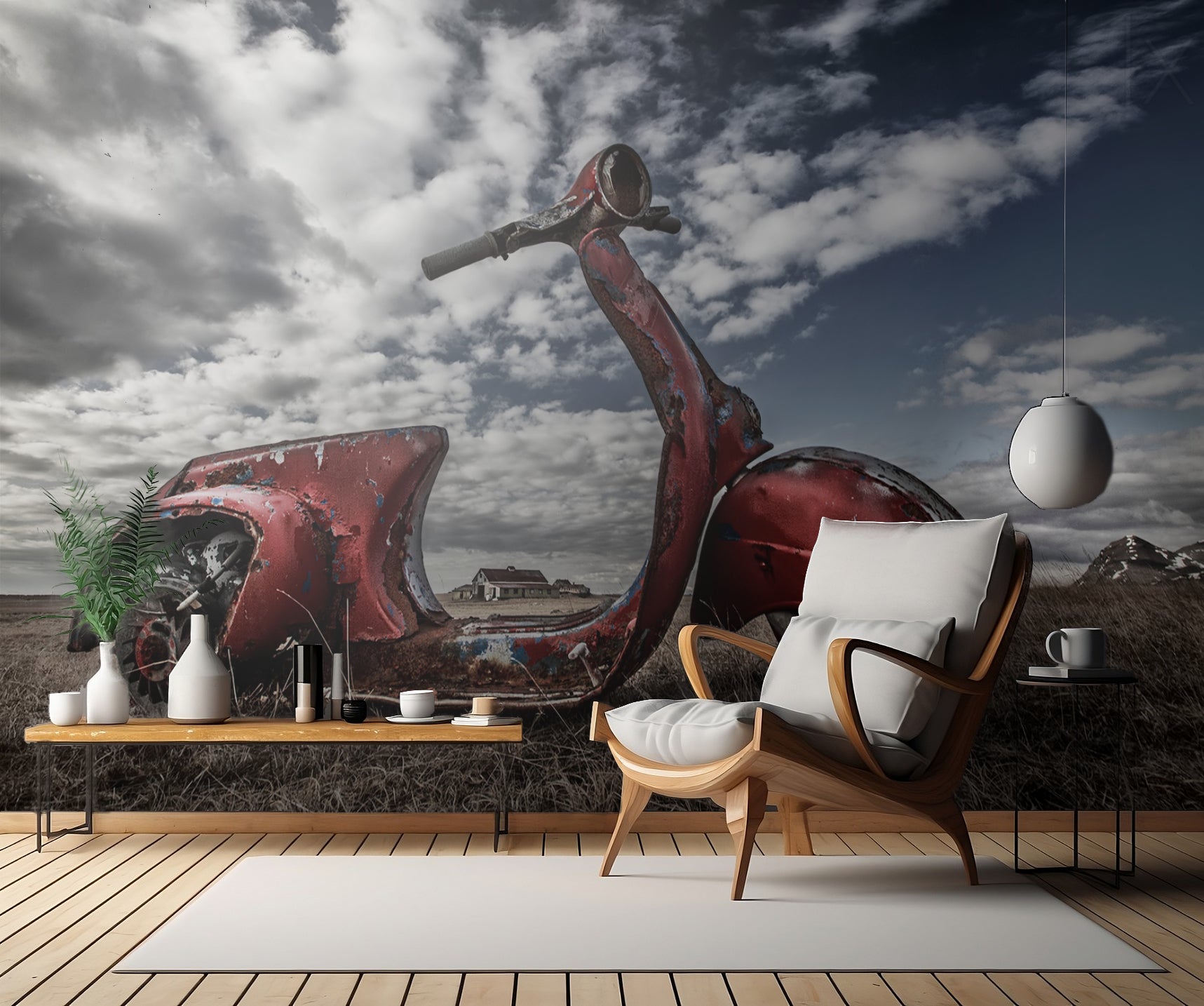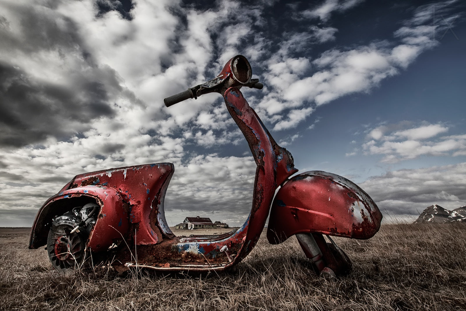 Upptäck Islands naturliga skönhet genom denna tapet som fångar landskapet vid Borgarfjordur. Varje detalj och nyans är perfekt återgiven, från de vidsträckta fälten till de gamla, övergivna gårdarna. Det förflutna överlappas med nutiden när du får en glimt av historien genom tapetens nedslitna och förfallna fordonsramar i bakgrunden.