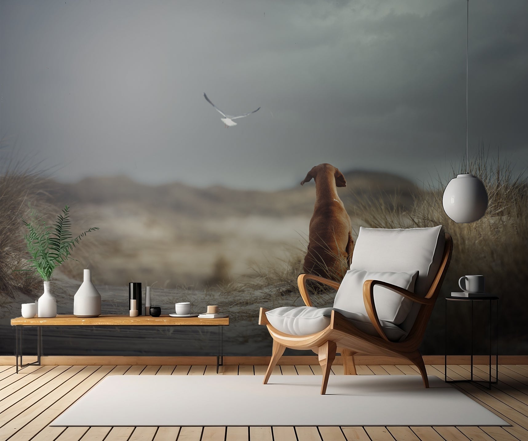 Med sin lugna och avslappnande atmosfär passar denna tapet perfekt för dig som drömmer om en plats där du kan känna dig fri och harmonisk. Med detaljerade illustrationer av hundar, måsar och strandlandskap skapar tapeten en känsla av frid och lycka i ditt hem.