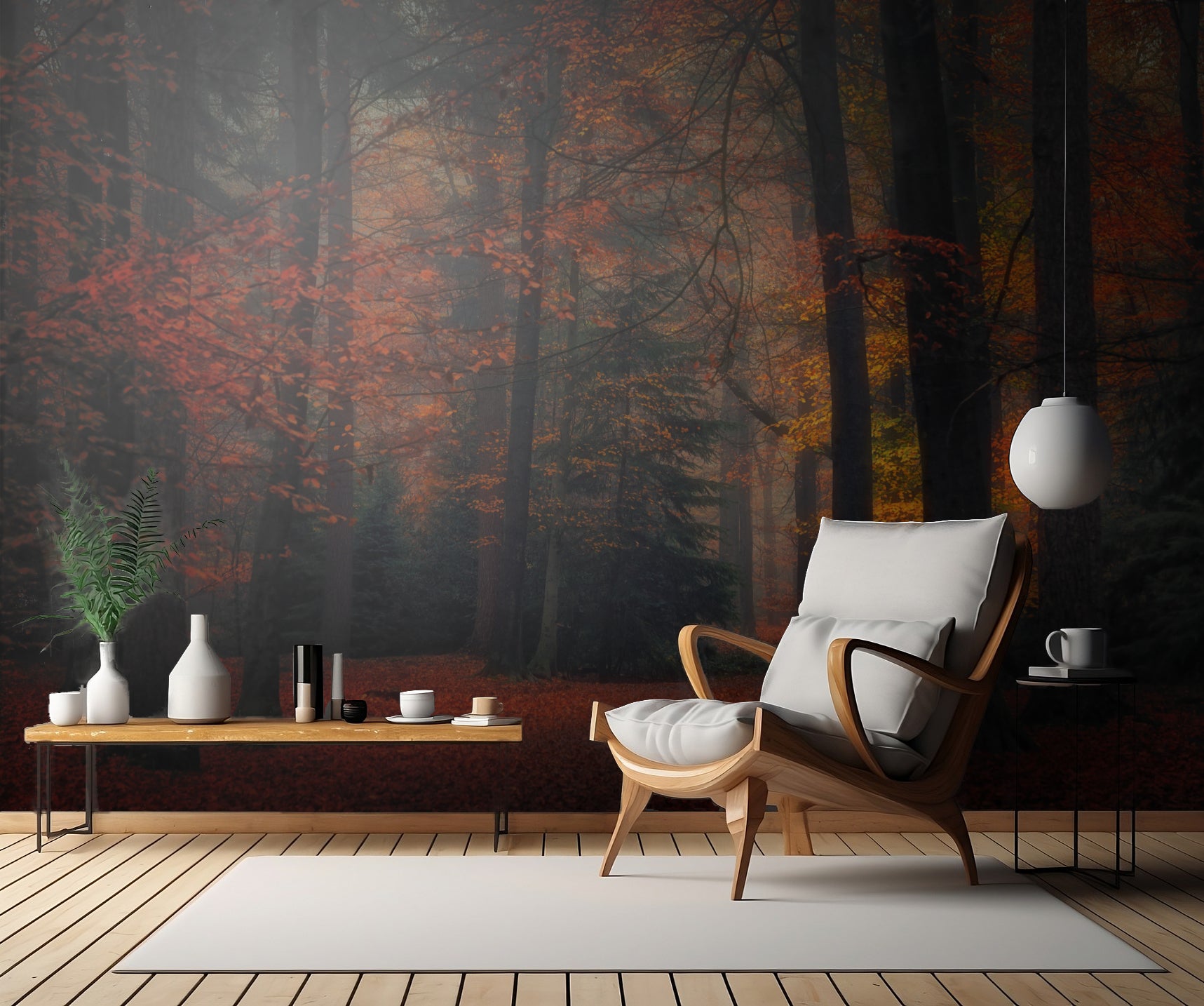 Vår fantastiska väggtapet "Frozen in Autumn" är inspirerad av de mystiska och förtrollande skogarna i Nederländerna. Skaparen Saskia Dingemans har fångat den röda höstens magi på ett helt unikt sätt.