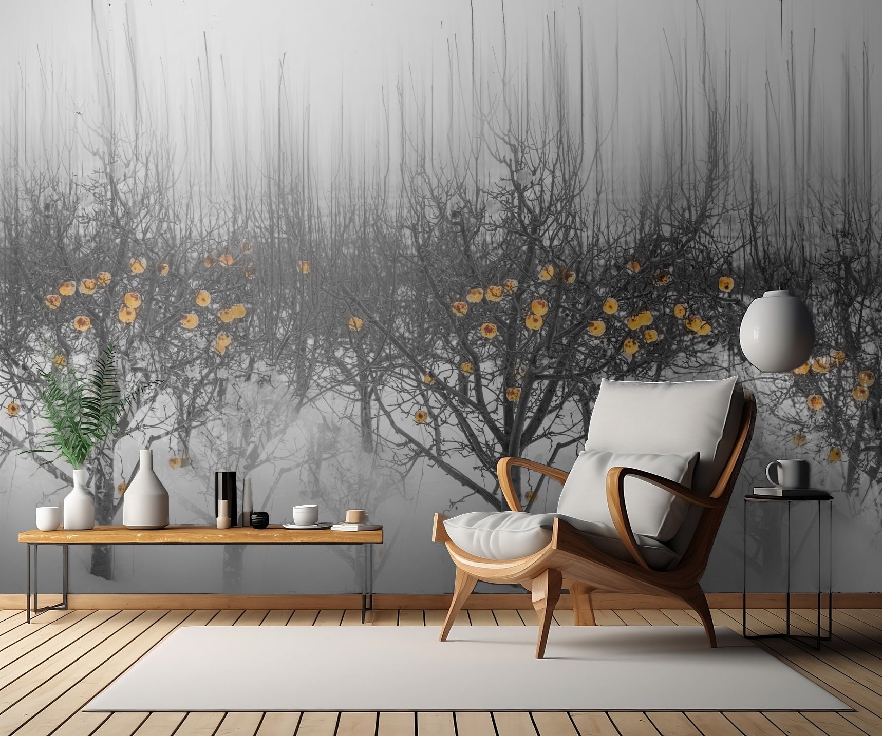 Den imponerande detaljerade bilden av äppelträdet ger ett intryck av autenticitet och förvandlar din vägg till en lugnande oas där du kan koppla av och njuta av din omgivning. Med sin perfekta balans mellan grönskande löv och glänsande gula äpplen förmedlar denna tapet en känsla av harmoni och friskhet.