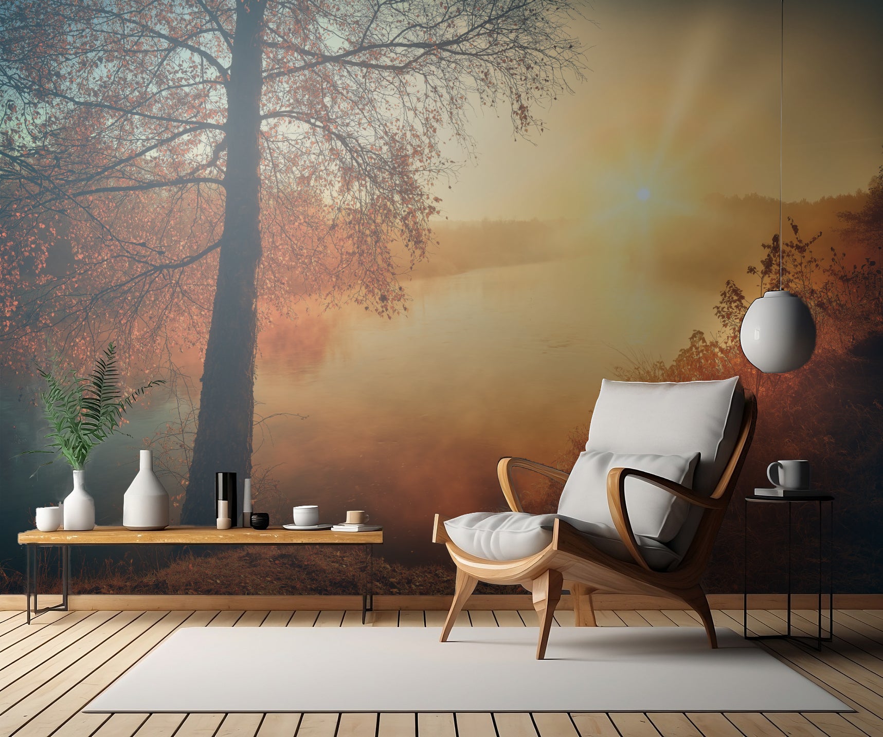 Tapetens motiv visar en vacker skogsscen i morgondimman, där trädens silhuetter dansar framför en spegelblank sjö. Genom att ha denna väggtapet på din vägg kan du nästan känna den friska höstluften och höra ljudet av löven som faller från träden.