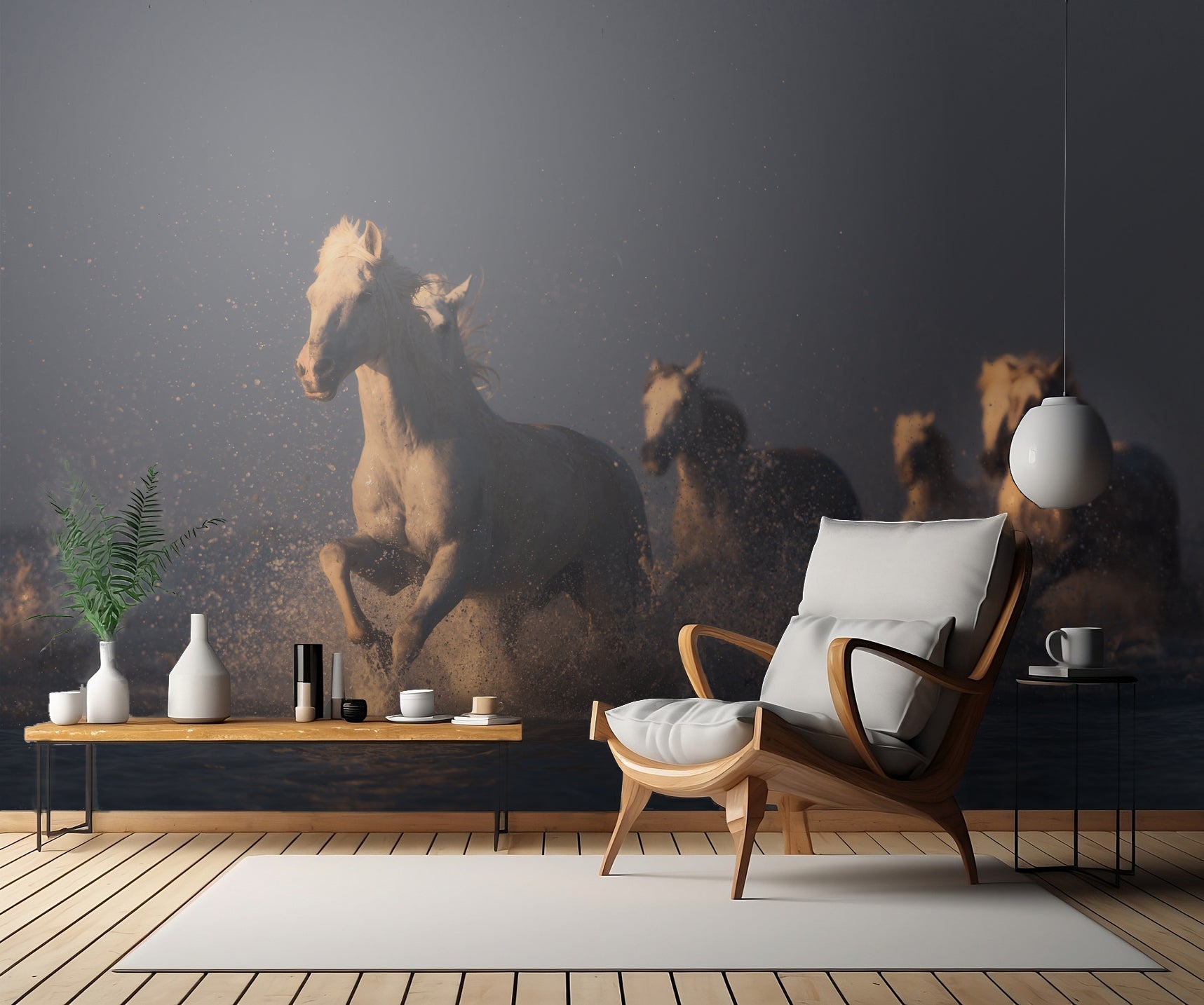 Med denna tapet kan du känna dig som om du är mitt bland de vackra hastarna, uppleva friheten i deras löpning och känna vinden och vattendropparna från deras galoppande. Det är som att vara en del av en sagolik scen där hästarna blir som änglar och enhörningar i det sprutande vattnet.