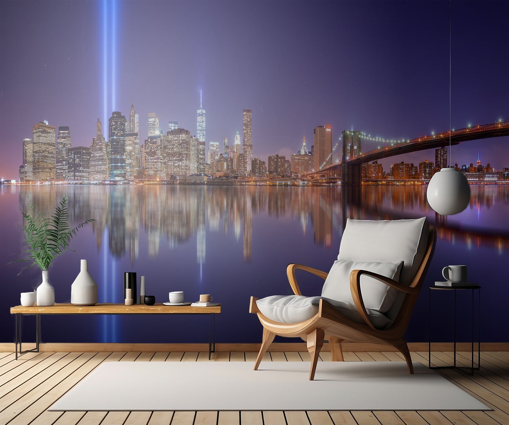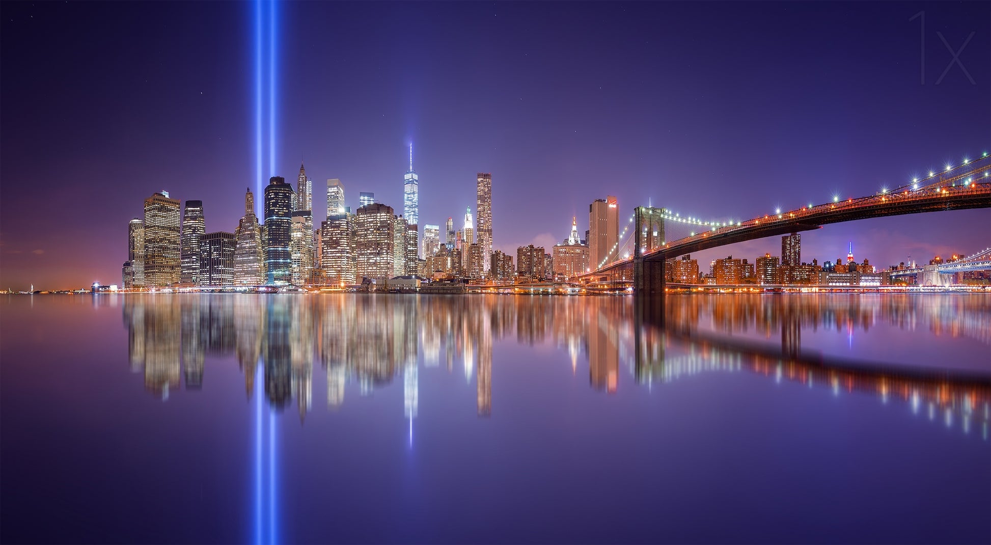 Ge ditt rum en touch av New York Citys magi med väggtapeten "In memorial" skapad av David Martin Castan. Denna vackra tapet fångar den ikoniska Brooklyn Bridge i skenet av nattens ljus, med dess spegelbild i Hudsonfloden som skapar en magisk atmosfär.