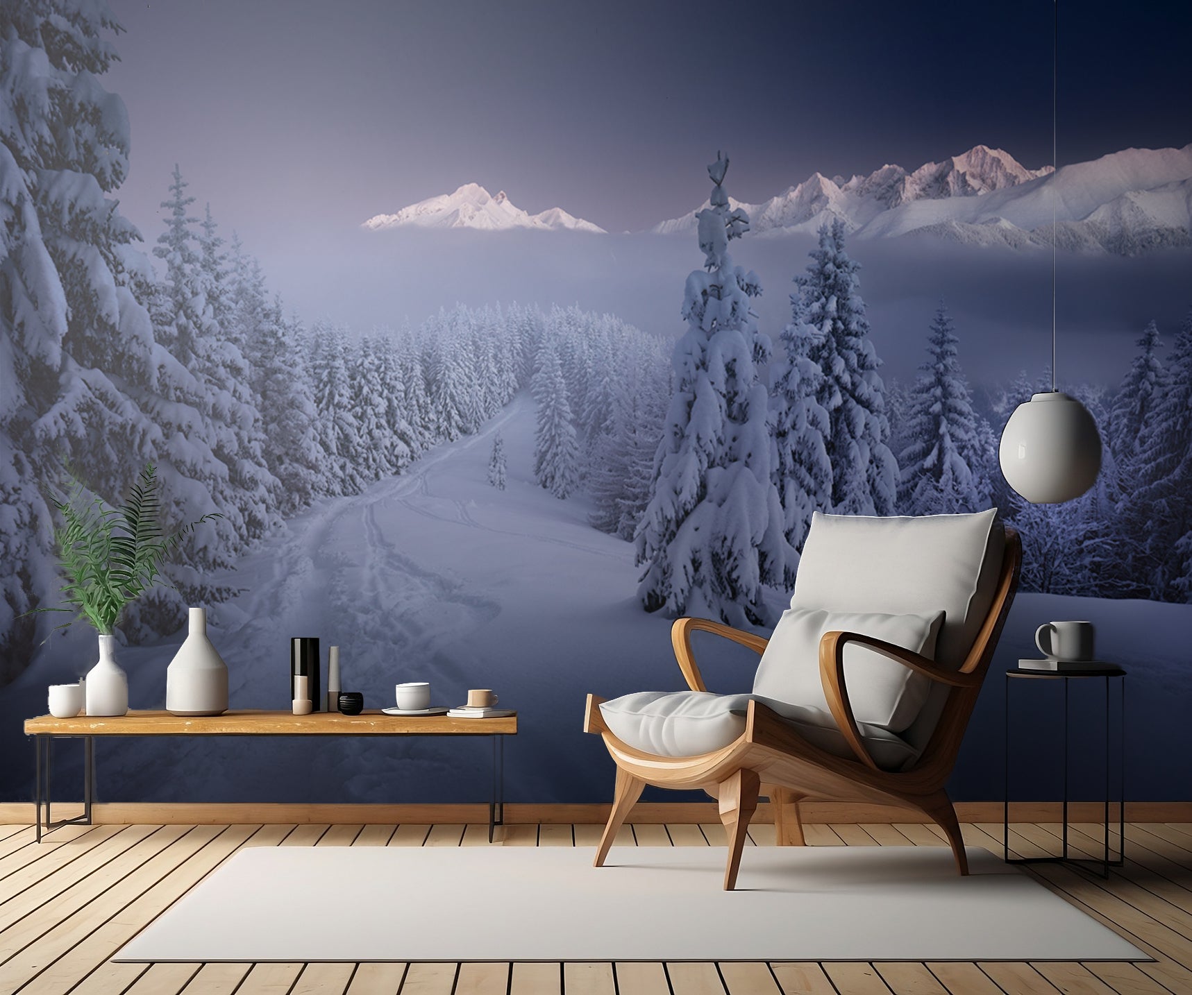 Tapeten speglar en pittoresk vintersäsong med dess spegelblanka snö och iskristaller som gnistrar i det vackra landskapet. Träden, klädda i ett lågtempererat vinterförkläde, är som konstverk i sig själva och bildar en förtrollande ram för den frostiga miljön. Med en naturmålning som denna får du nästan känslan av att befinna dig mitt i det vita snöparadiset.