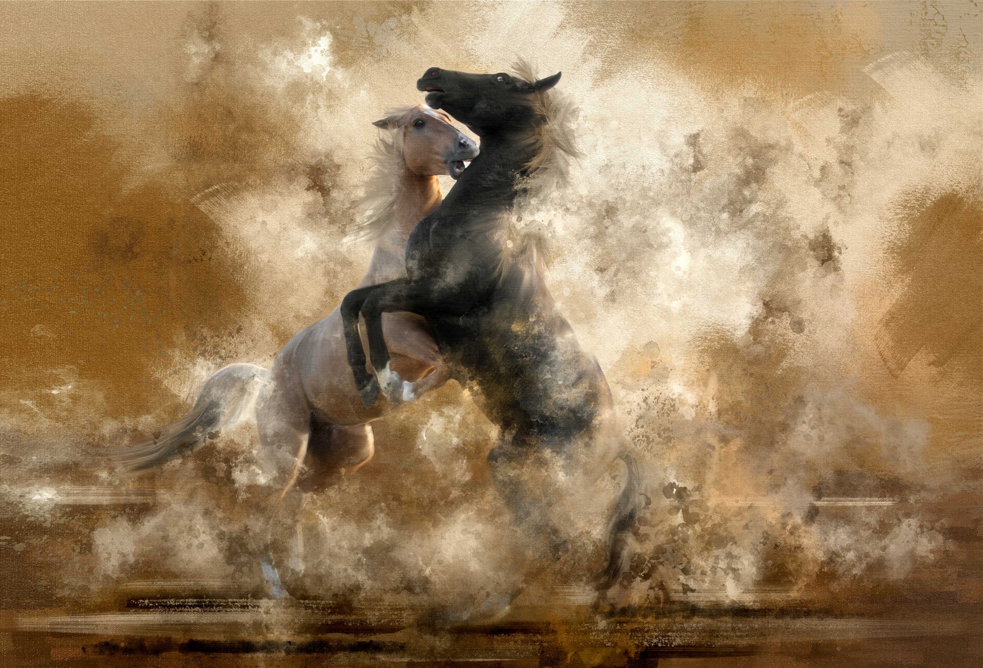Väggtapeten visar en imponerande bild av hästar i en intensiv duell. Den dramatiska kampen fångar ögonblicket då hästarna når sin peak, med rök och damm som virvlar runt dem.
