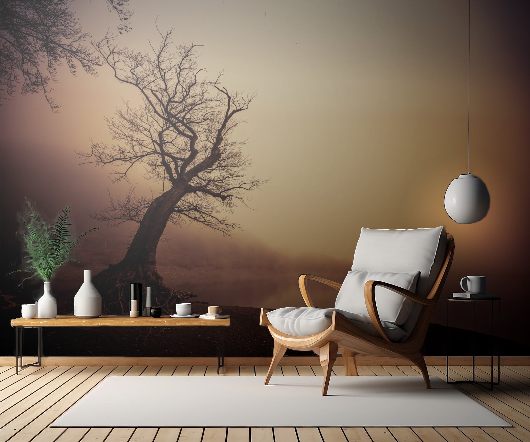 Denna exklusiva väggtapet fångar det ögonblick då orange dimma sveper in över landskapet och skapar en suggestiv dimma och en förtrollande atmosfär. Det ensamma trädet framträder i förgrunden och skapar en känsla av ensamhet och stillhet.