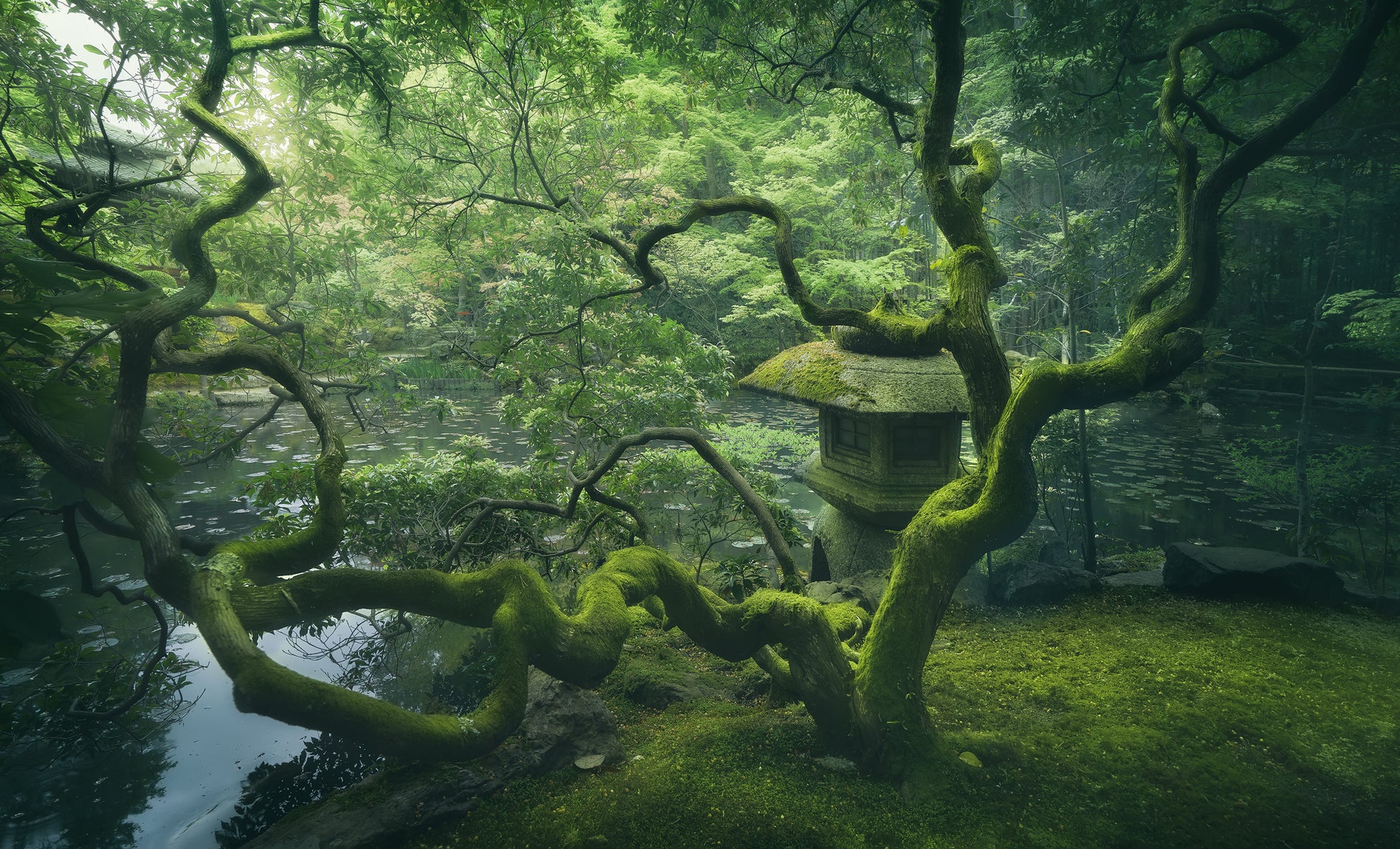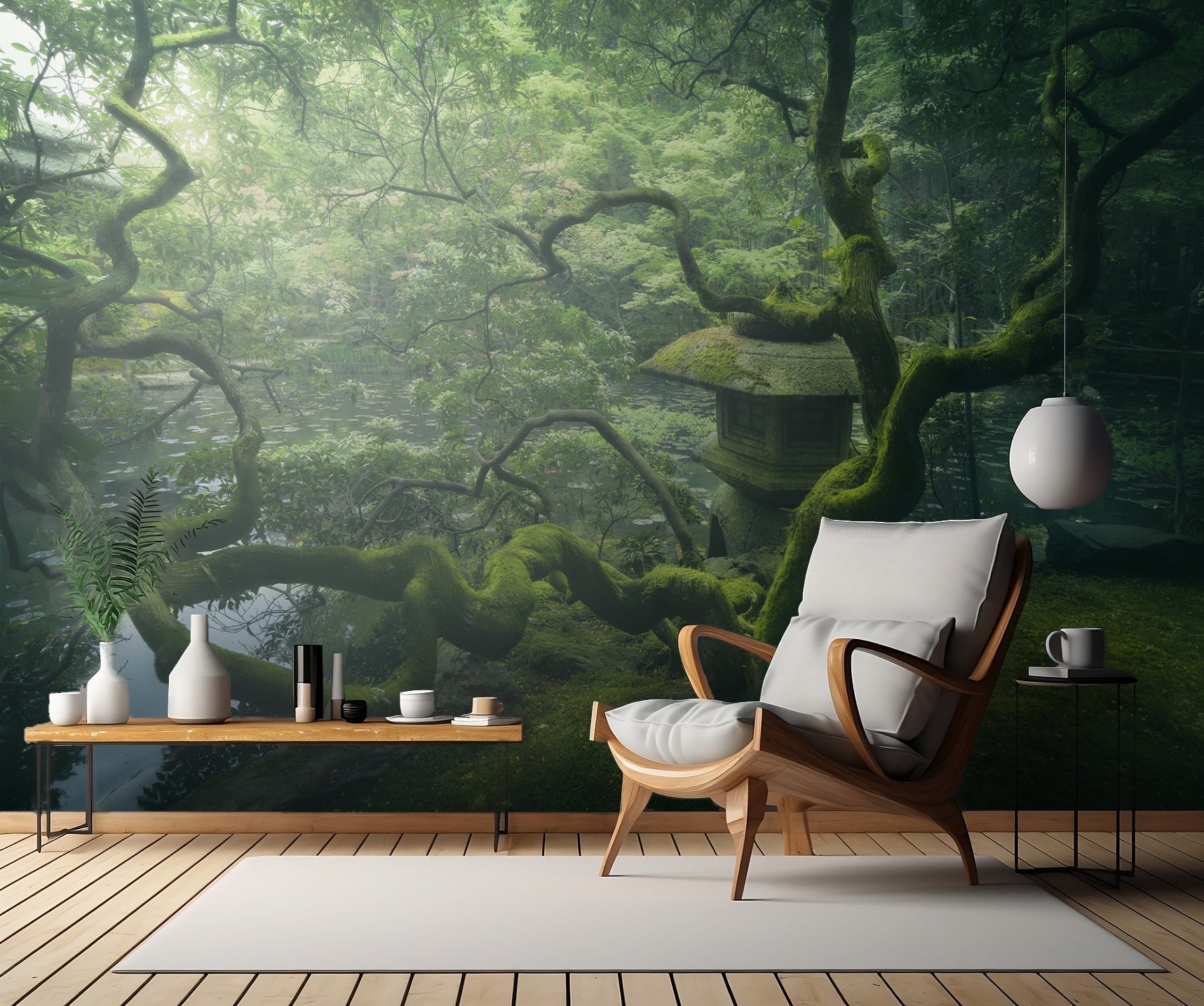 Med "Japanese Tree" får du en imponerande panoramabild som sträcker sig över hela rummet, vilket skapar en känsla av rymd och djup. De mustiga gröna tonerna, det frodiga mossan och de spegelklara vattendragen ger dig en känsla av lugn och ro. Vare sig du vill använda tapeten i ditt hem eller på en spaanläggning så kommer den definitivt att ge en känsla av avkoppling och mindfulness.