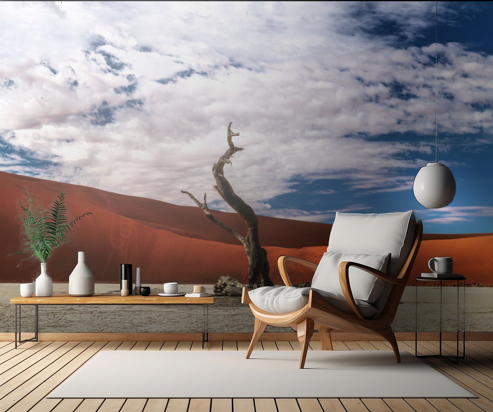 Last Stand" är den perfekta väggtapeten för dig som vill skapa en atmosfär av mystik och äventyr i ditt hem. Med sin magnifika bild av en ökenlandskap i Namibia förmedlar den en känsla av både skönhet och förlorad glans. Medan dina ögon sveper över tapeten dras du in i en värld av torra trädsilhuetter som sträcker sig mot den molnfyllda himlen, skapandes en dramatisk kontrast mellan det levande och det döda.