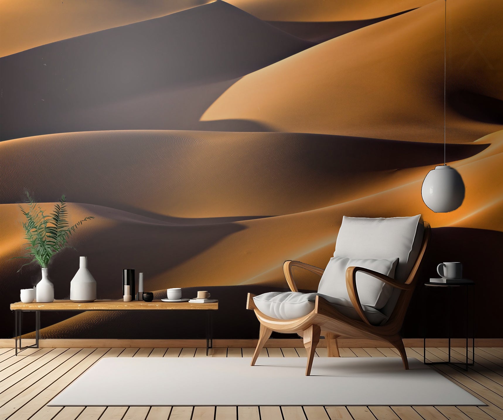 Ge ditt rum en touch av ökenlandskap med väggtapeten "Light and Shadow" skapad av den begåvade konstnären Mohammadreza Momeni. Tapeten fångar det abstrakta och vackra i ökensanden och sanddynerna, med sina mjuka kurvor och skiftande ljus och skuggor.