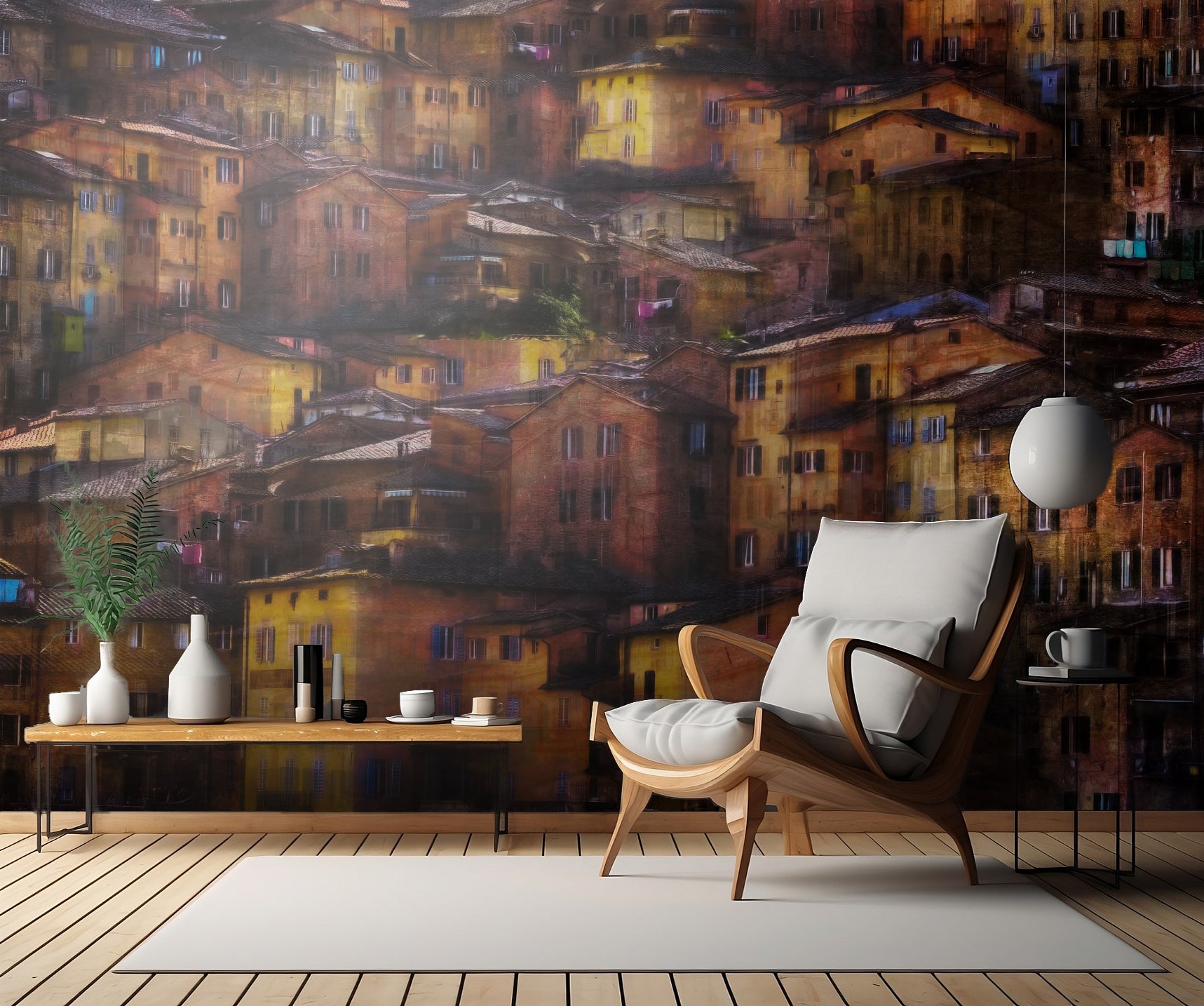 Denna unika väggtapet tar dig med på en resa genom en värld av stadslandskap, där du kan njuta av både storslagenheten i en stad och den pittoreska charm som finns i en by. Med dess dubbelexponeringsdesign lyckas "Living on the Hill" fånga den urbana pulsen samtidigt som den framhäver den lantliga skönheten.