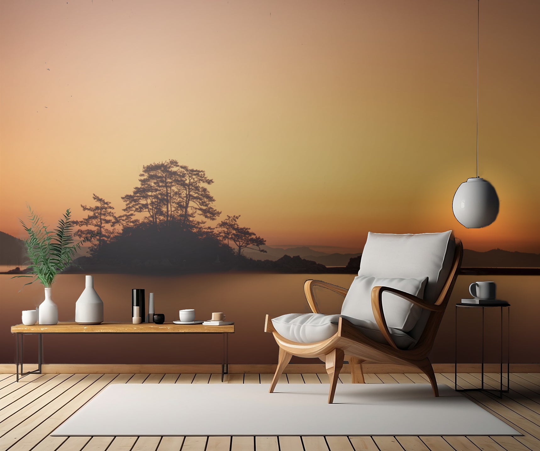 En himmel målad i omfamnande nyanser av orange ger dig en verklig solnedgångs-känsla, och du kan nästan höra vågornas susande mot klipporna. Detaljerna i landskapet, från de vajande träden till de silkeslena kullarna, ger en grafisk skönhet till rummet och tar dig med på en resa bortom det vanliga.