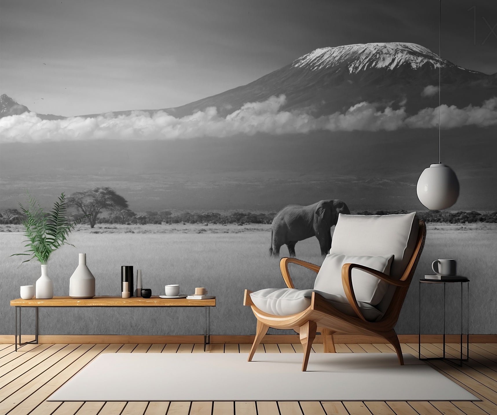 Med en inspirerande kombination av färg och svartvitt, tar denna tapet med dig till Kenyas majestätiska landskap. Den imponerande Kilimanjaro-bergen, omgivna av moln och snöklädda toppar, blir en fantastisk kontrast till Afrikas varma savanner och safarier.