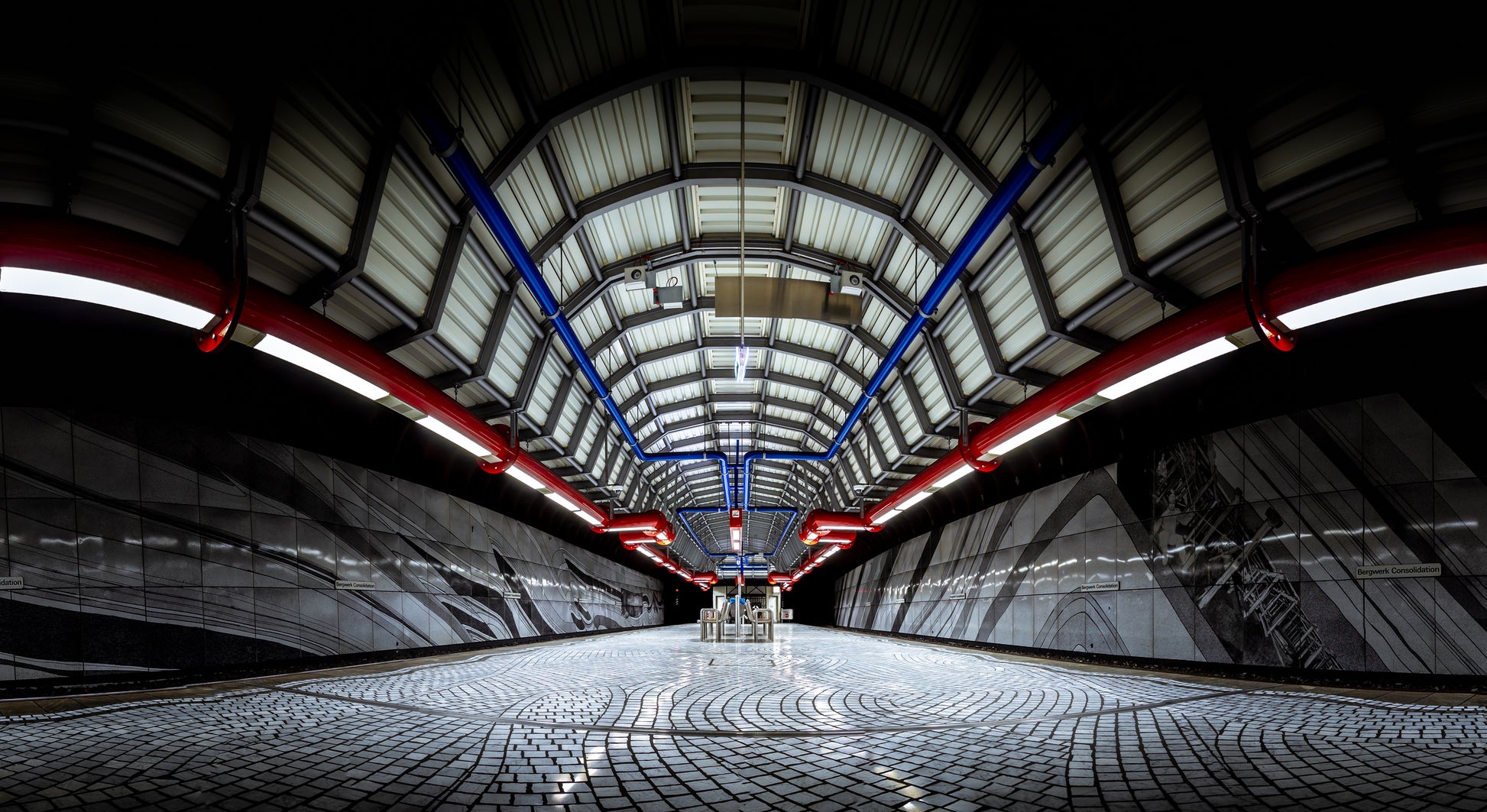 Med dess fokus på arkitektur och perspektiv tar tapeten dig direkt till den ikoniska plattformen under jord. Genom en skickligt använd teknik visar Jörg Vollrath oss en imponerande vinkling som ger en känsla av att vara mitt i händelsernas centrum. Ifrån tapetens vignettkant ser vi de fantastiska byggnaderna och försvinningspunkten som ger bilden en dynamisk och illusionistisk effekt – du får verkligen känslan av att vara på tunnelbanan.