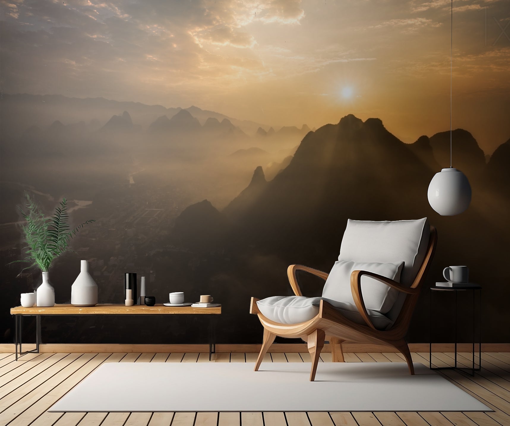 Vakna upp till en magisk soluppgång varje dag med vår väggmålning "Misty Sunrise". Med en dramatisk och dimmig utsikt från de kinesiska klipporna i Guilin, tar denna tapet dig med på en resa till ett av Asiens mest ikoniska landskap.