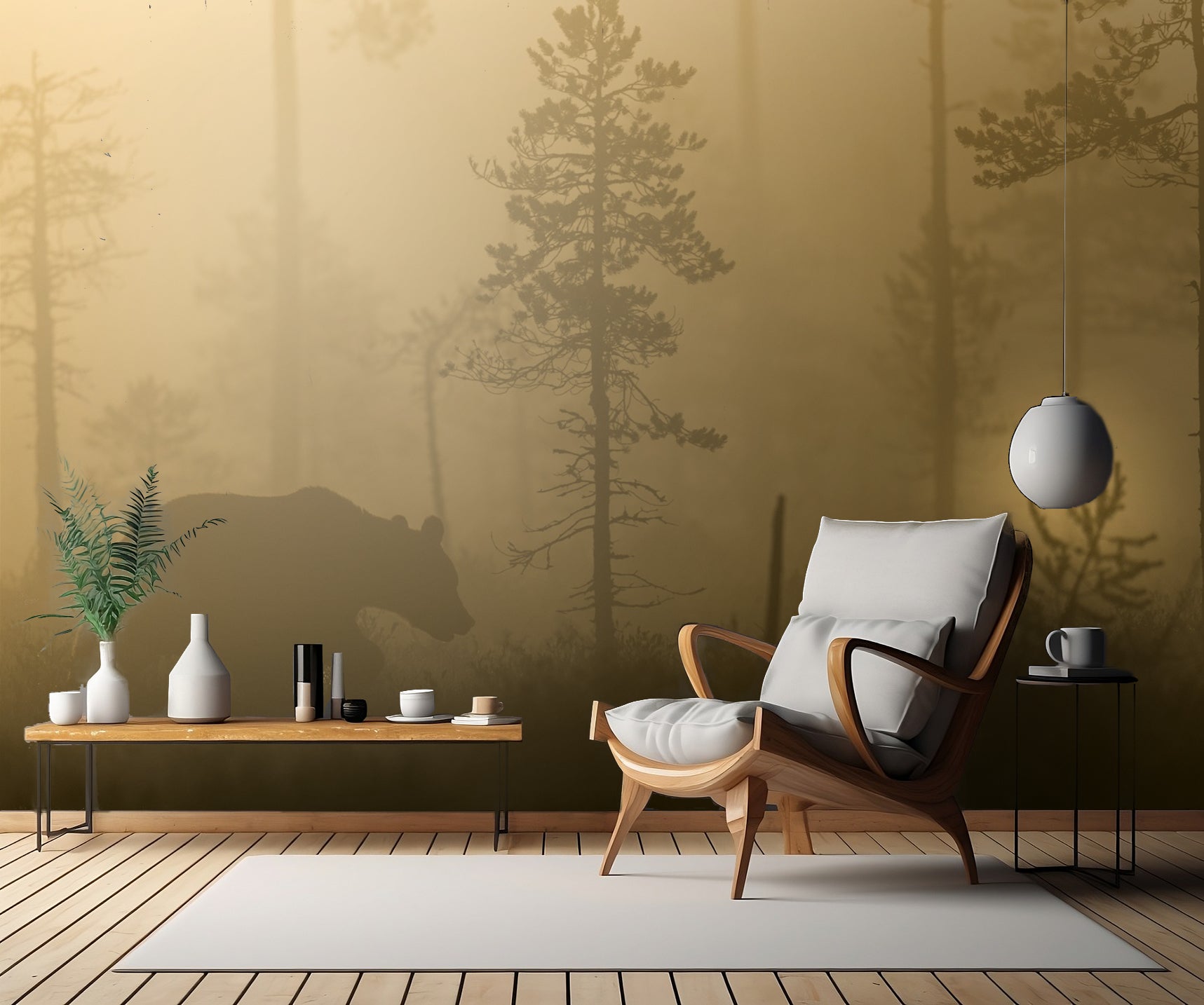 Upplev en naturskön morgon med väggtapeten "Morning Fog", skapad av konstnären Svein Ove Linde. Njut av en dimmig skogsmiljö där morgondiset sveper över träden och skapar en mystisk atmosfär. Känn dig omringad av vildmarkens styrka och kraft när du betraktar den imponerande björnen, skogens främsta jägare.