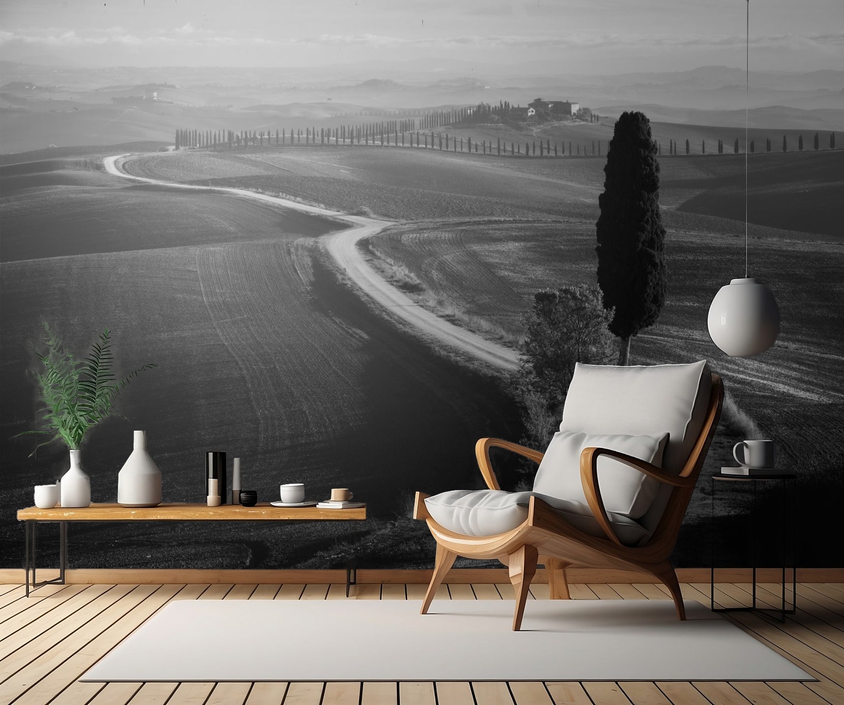 Morning in the field" är en fantastisk väggtapet som skapar en lugn och fridfull atmosfär i ditt hem. Med motiv av cypresser och landskap i svartvitt ger tapeten en tidlös och elegant känsla till ditt rum. Skaparen Rostovskiy Anton har skapat en vacker bild av landsbygden med dimma och dis, vilket ger en mystisk och drömlik känsla.