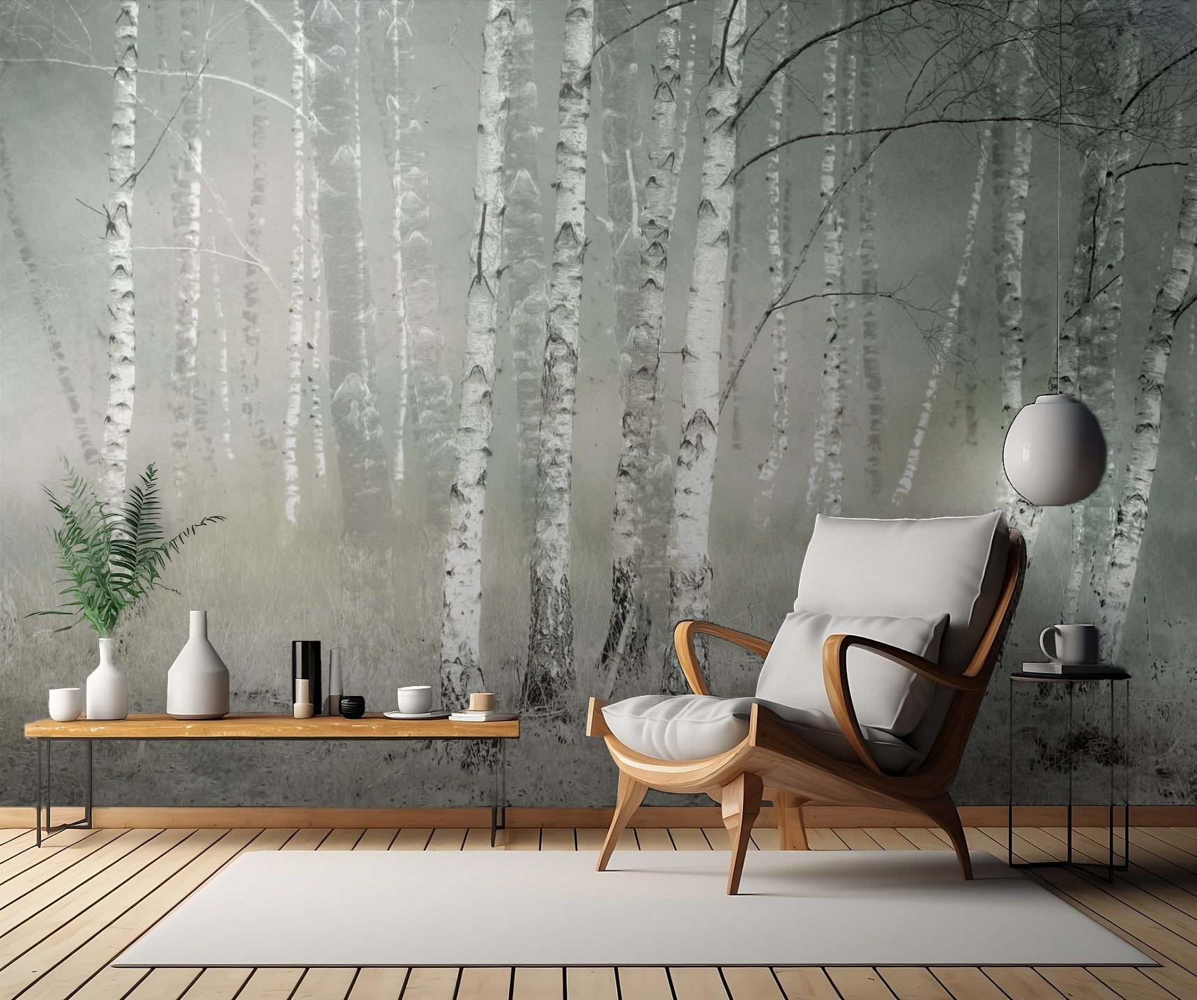 Med de mjuka pastellfärgerna och de målade björkstammarna ger tapeten ett intryck av en daggfrisk morgon eller en stilla skogsvandring.