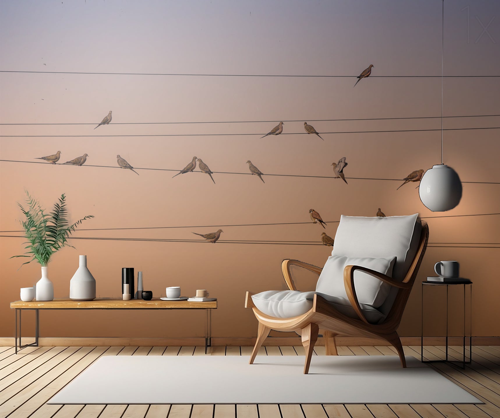 Tapeten visar fåglarna som sitter på trådarna och sjunger i den tidiga gryningen, samtidigt som solens strålar börjar sprida sitt varma ljus över landskapet. En perfekt representation av harmonin mellan naturen och musiken, där tonerna flyter fritt som linjer i luften.