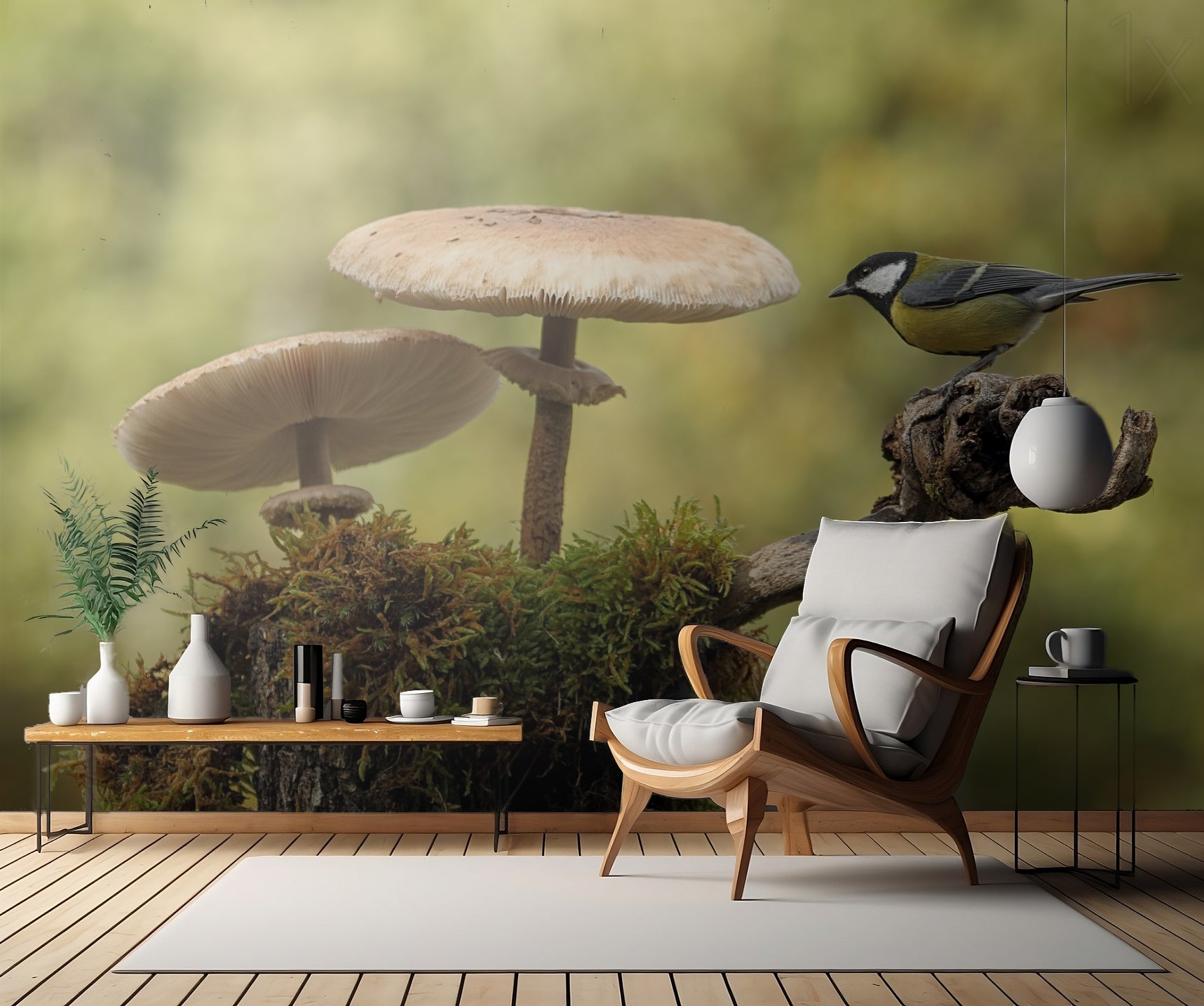 Ta med naturen in i ditt hem med väggtapeten "My small part of the world" av Nicolás Merino. Denna tapet för tankarna till vilda skogar och små varelser som lever sin vardag bland grenar och rötter. Fåglar som den gula titor, även känd som Parus Major eller Great Tit, flyger fritt över ditt rum medan svampar och mossa skapar en känsla av vildmark.