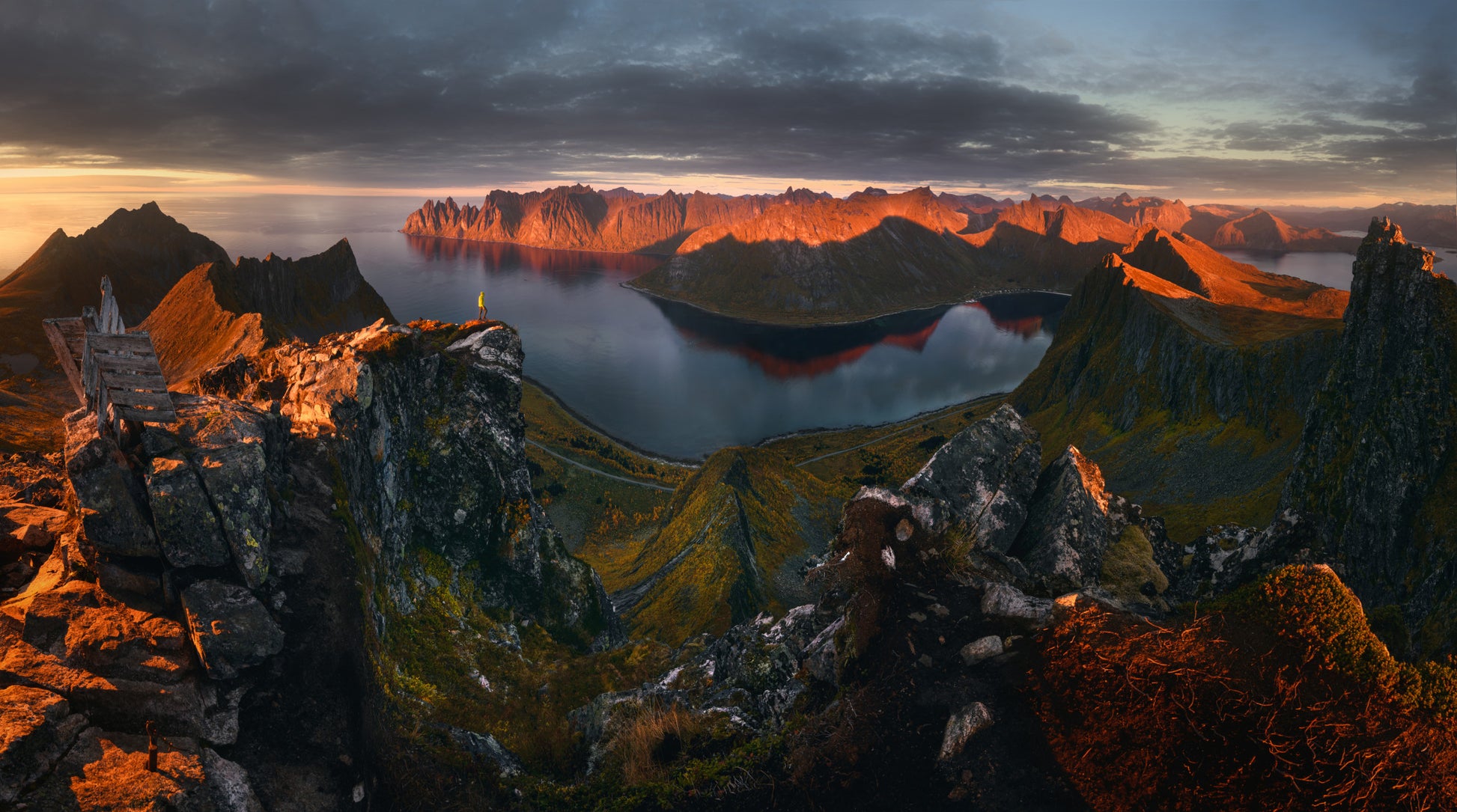 Panoramautsikten fångar både den robusta kusten och den lugna hela naturen. Upplev Norges magnifika arktiska landskap genom tapeten som ger dig en känsla av att vara mitt i den vilda naturen.