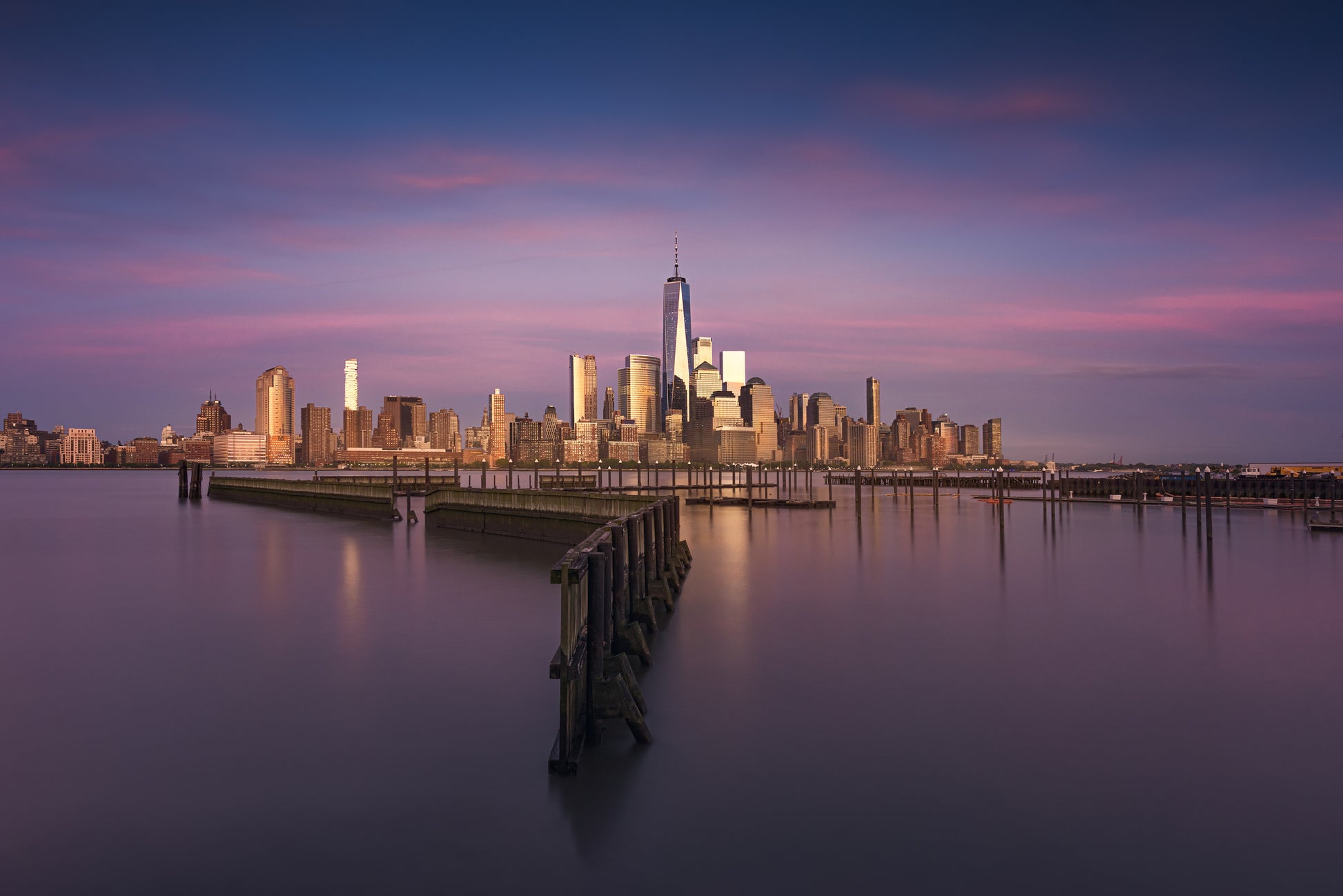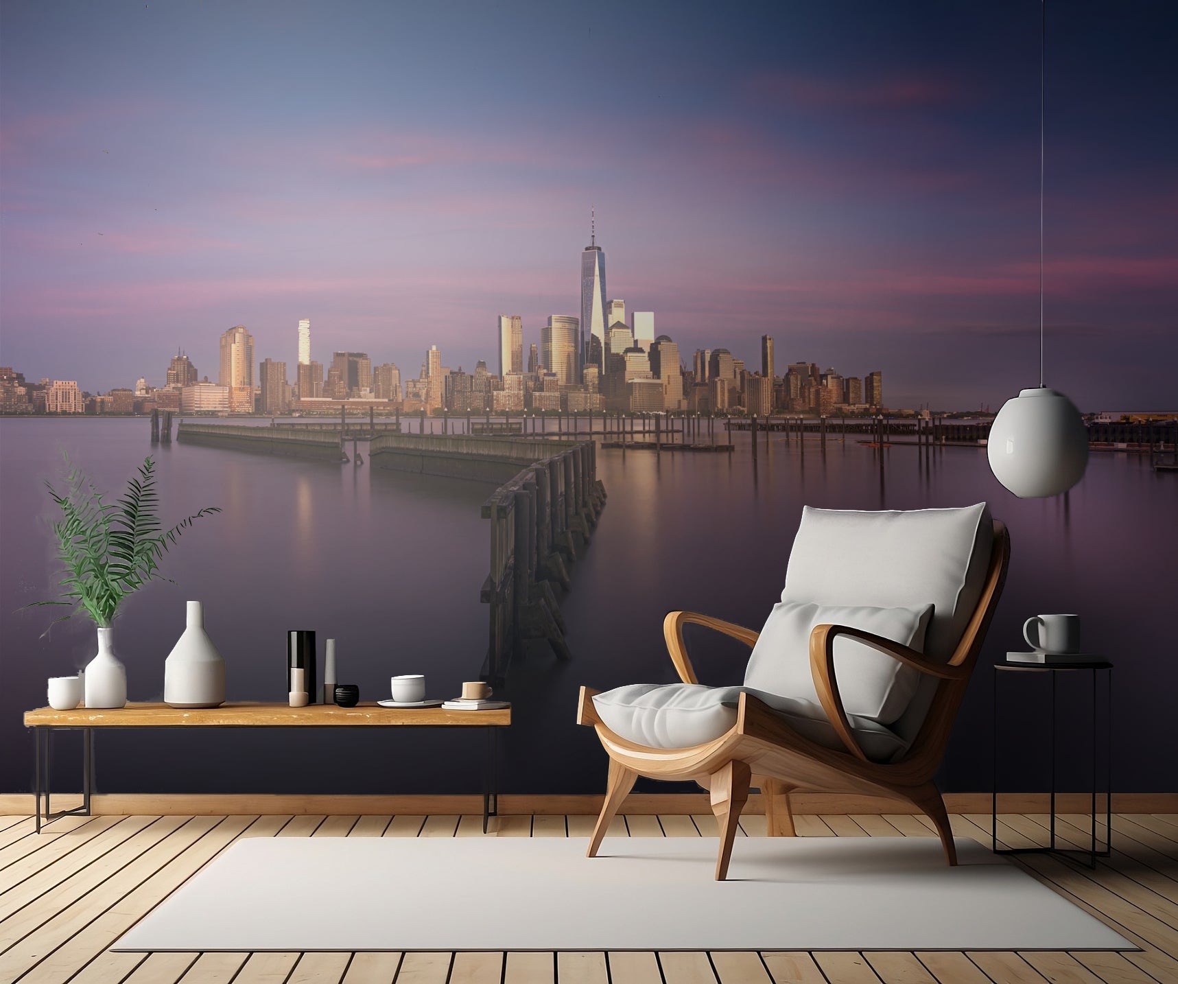 Stäng dina ögon och föreställ dig att du står vid vattnet, medan solens strålar reflekterar på Hudsonfloden. Du blickar upp mot den imponerande stadssilhuetten och ser ikoniska skyskrapor som Empire State Building och One World Trade Center resa sig mot himlen. Denna tapet fångar verkligen den urbana och moderna känslan av New York.