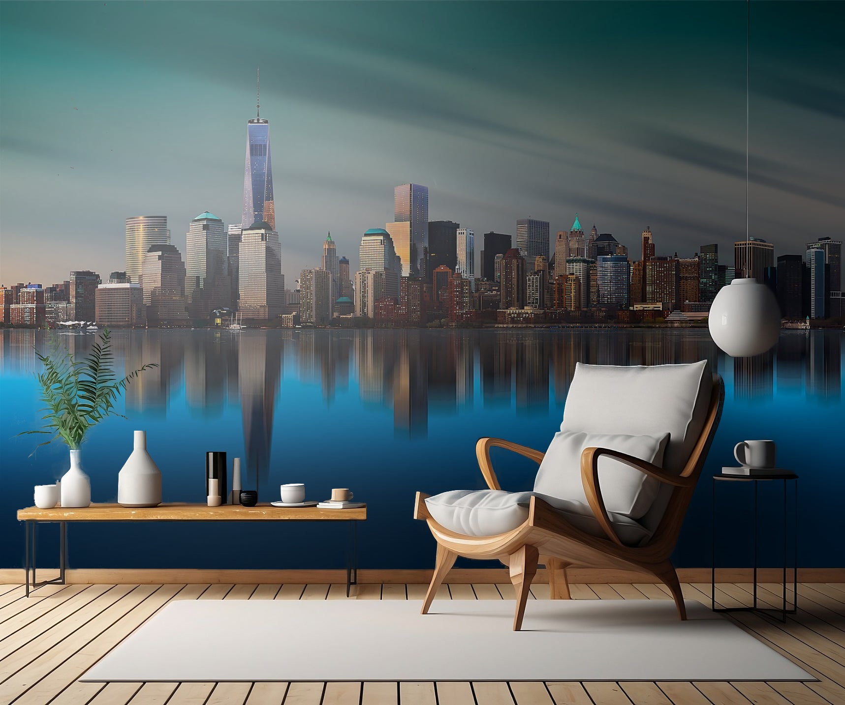 Tapeten visar Manhattans silhuett med de berömda skyskraporna i World Trade Center-klustret som sticker upp mot en klar blå himmel. Reflection av de imponerande byggnaderna i vattnet skapar en spektakulär effekt som ger en känsla av rymd och öppenhet.