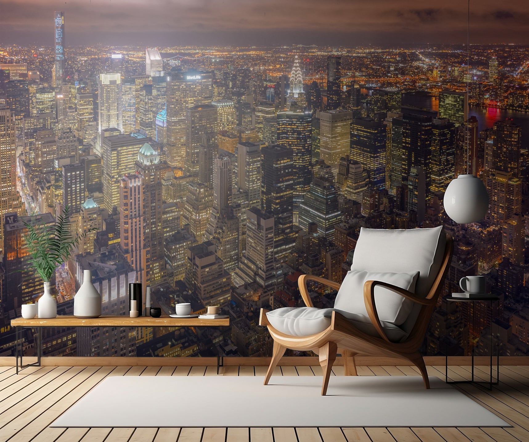 Njut av den pulserande staden som aldrig sover direkt på din vägg med väggtapeten "Night Life" skapad av den talangfulla Milton Mpounas. Denna moderna och futuristiska tapet fångar New York Citys ikoniska skyline på ett sätt som tar andan ur dig. Genom att kombinera skyskrapor, belysning och distinkta landmärken som Chrysler Building skapar denna tapet en urbansk känsla som verkligen tar din inredning till nya höjder. Med en ratio på 1:5 är tapeten designad för att ta sin plats som ett imponerande konstverk på din vägg. Ge ditt hem en touch av storstadens energi och välkomna "Night Life" in i ditt rum redan idag.