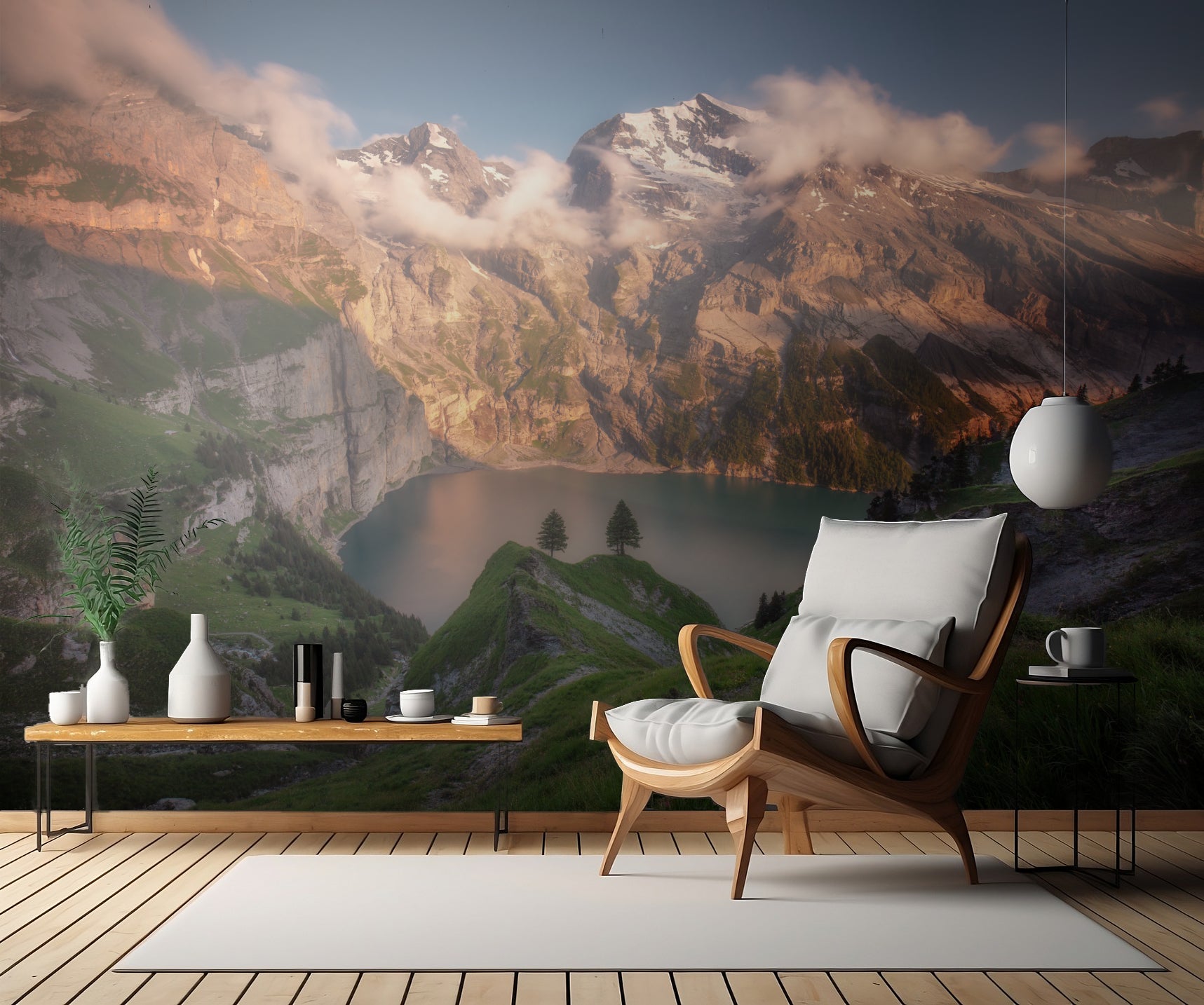 Upplev Oeschinensee och njut av den lugna skönheten i detta storslagna landskap. Vi är övertygade om att denna väggtapet kommer att bli en imponerande och omdiskuterad detalj i ditt hem. Så ge ditt rum det perfekta lyftet och välj Oeschinensee väggtapet - en oemotståndlig skönhet inspirerad av schweiziska alperna.