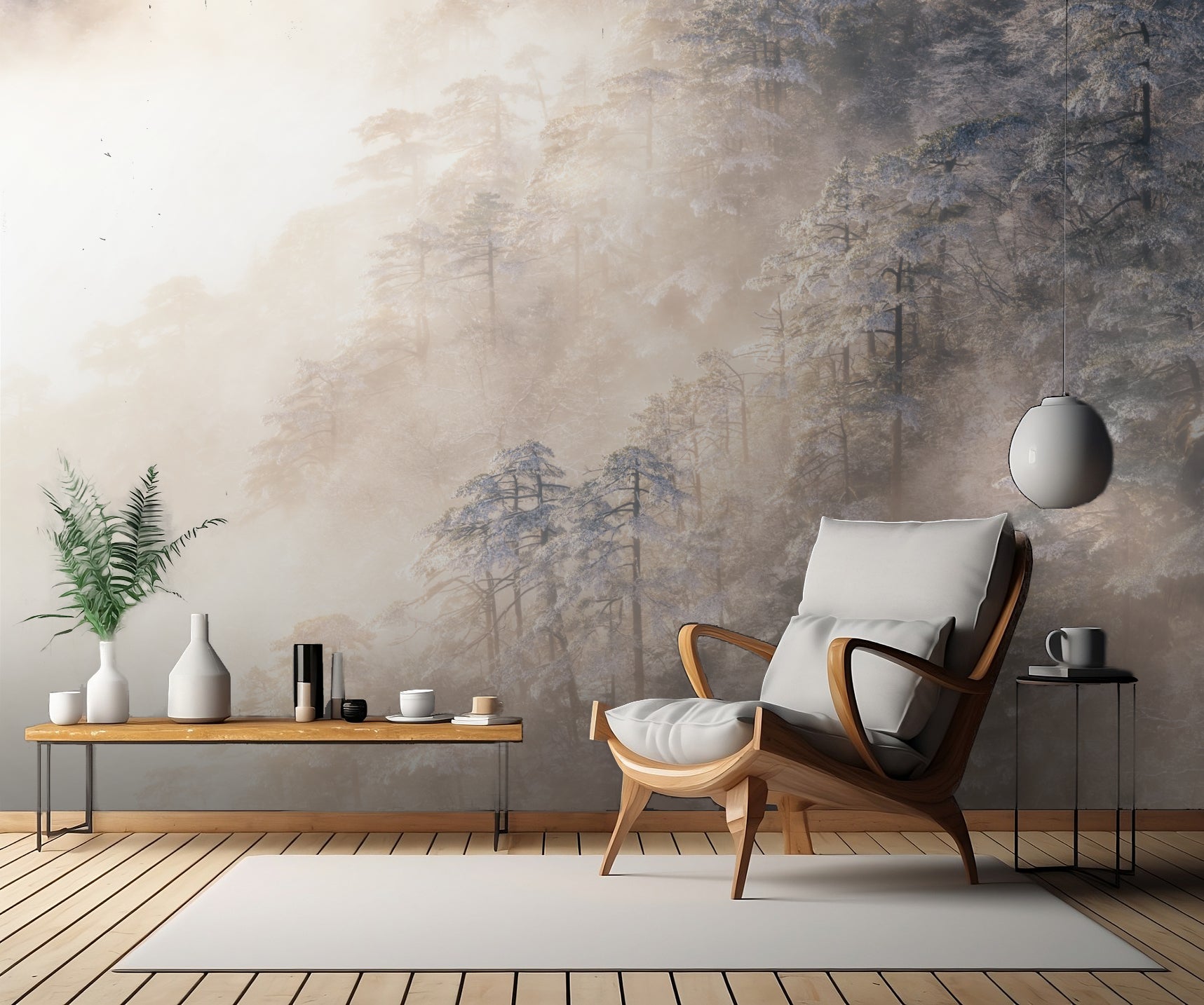 Tapetens motiv fångar magin i morgonljusets strålar som bryts genom dimma och moln, vilket skapar en förtrollande dimhöljd atmosfär. Den ljustäckta skogen av Pinus taiwanensis ger rummet en frisk och naturnära känsla, och skapar en oas där du kan slappna av och låta dina tankar vandra fritt.
