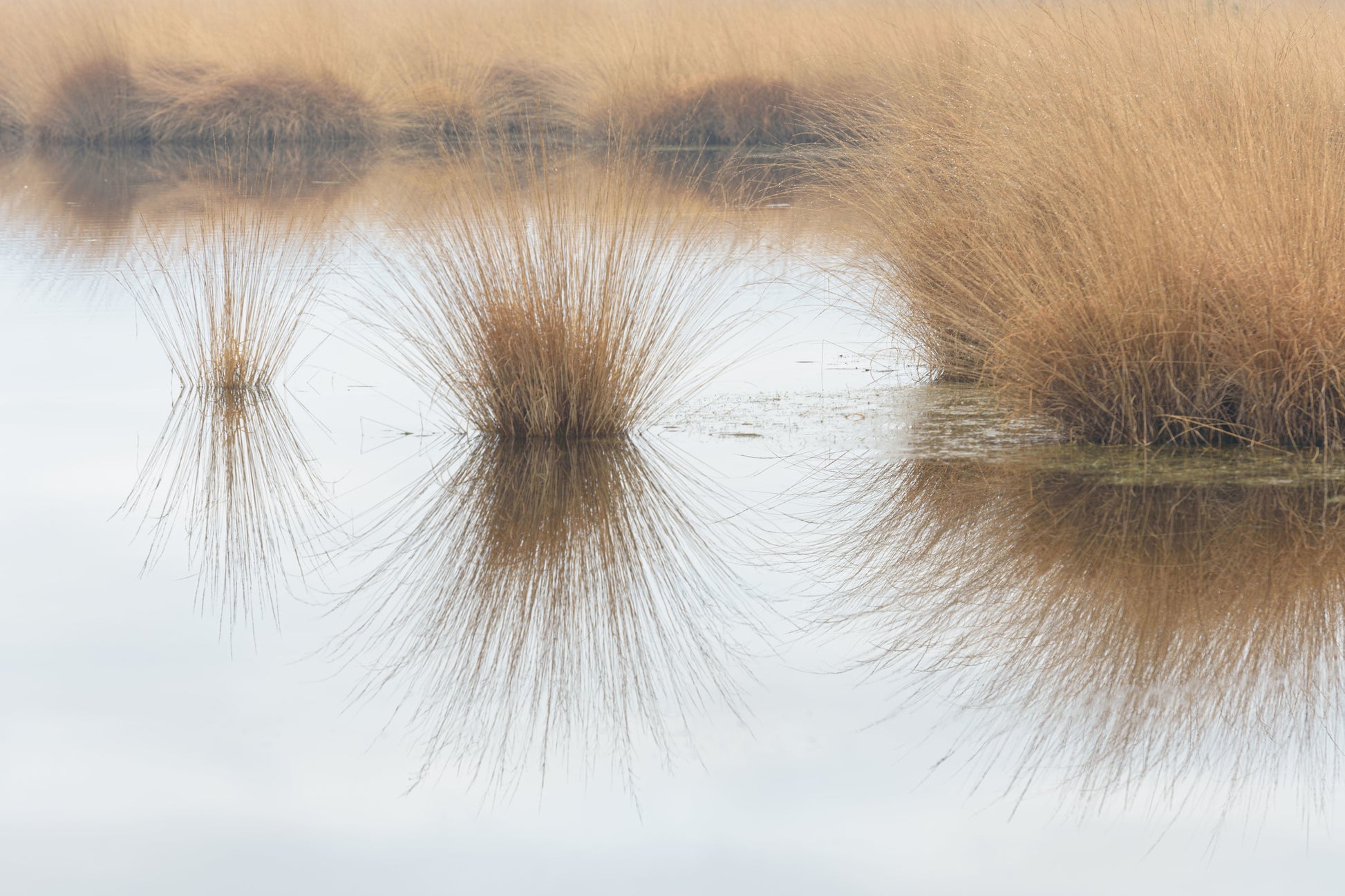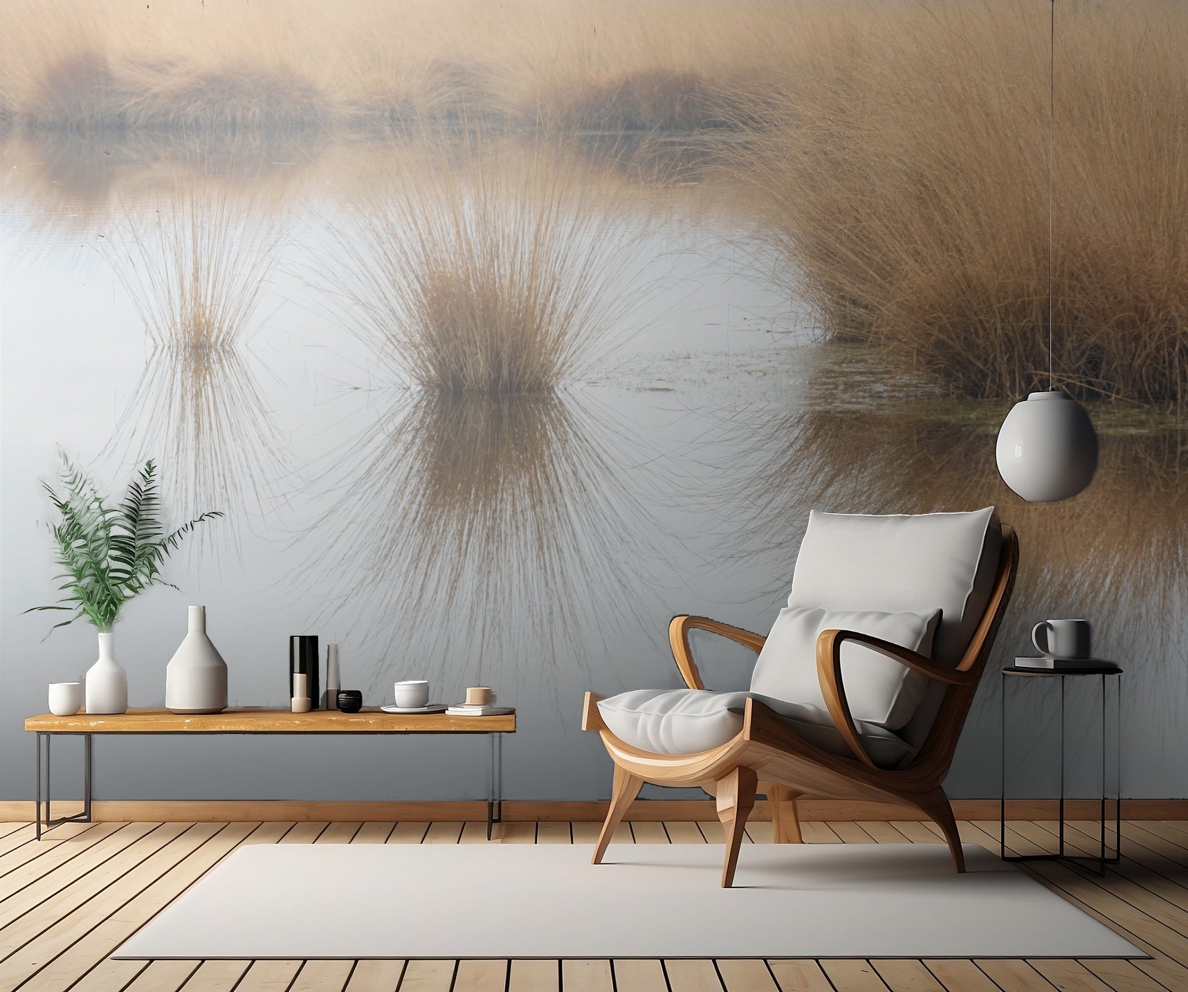 Ta med naturen in i ditt hem med den vackra väggtapeten "Piping straw", skapad av Ann Cornelis. Denna tapet förmedlar en känsla av lugn och harmoni med sitt motiv av vatten, reflektioner, vass, gräs och landskap.