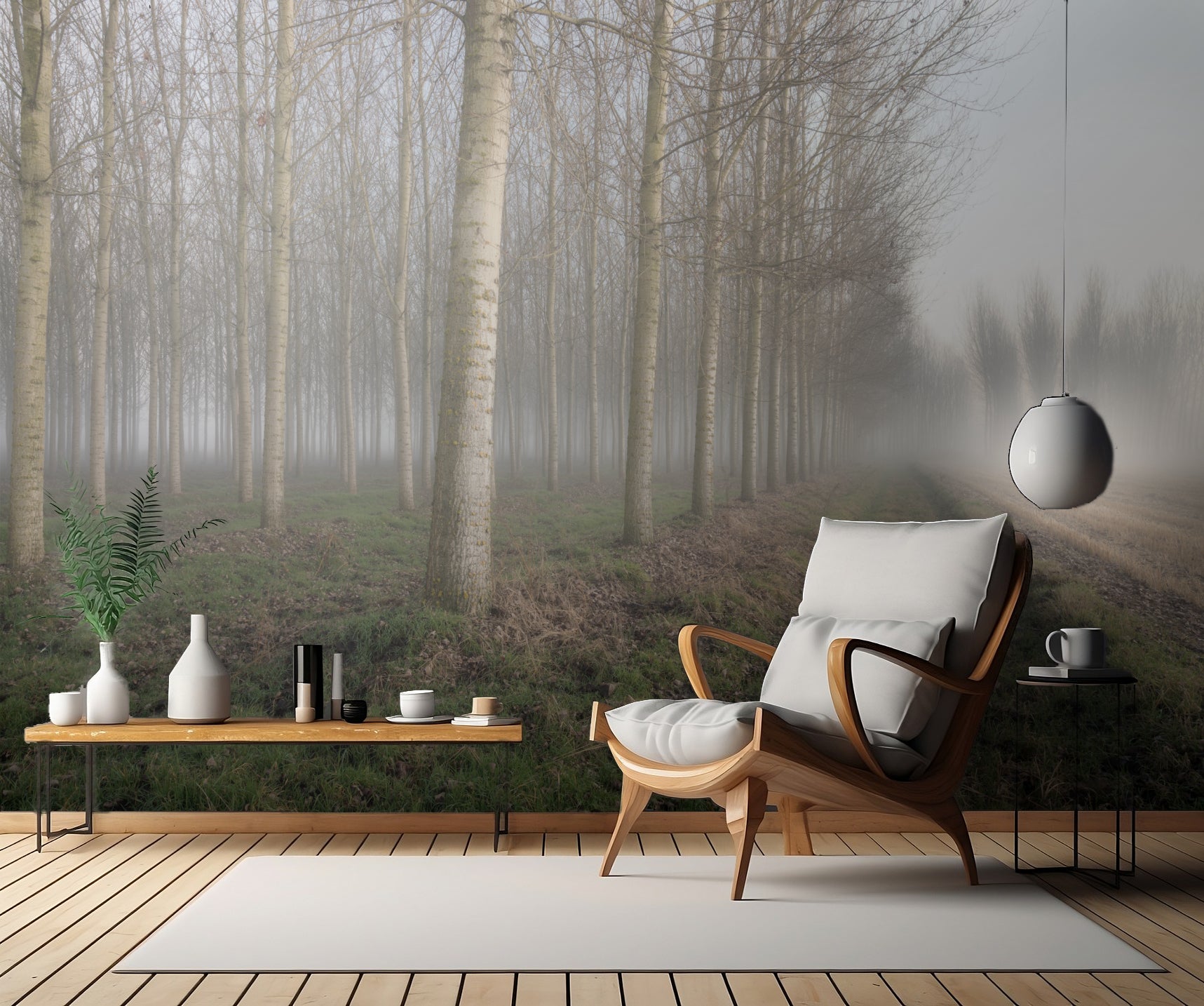 Med en sofistikerad kombination av dimma, vinter och skog, förvandlar "POPLARS IN THE MIST" omedelbart ditt rum till en kall och frostig skogslandskap. Den subtila nyansen av grått och avtonade färger ger en desaturerad effekt som adderar en extra dimension av lugn och skönhet till rummet.