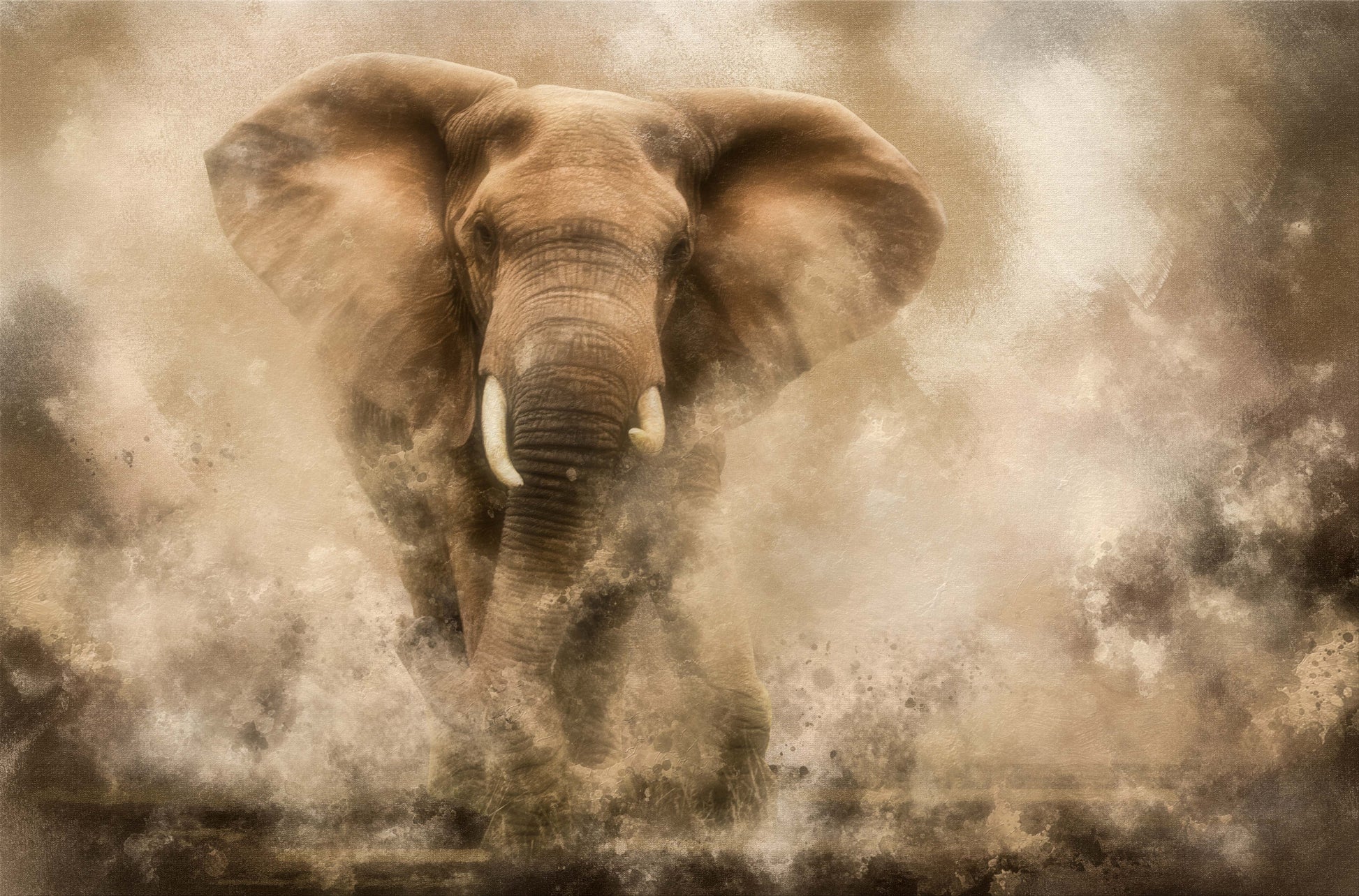 Ge ditt hem en touch av storhet och majestät med denna extraordinära väggtapet. Skapa en atmosfär av kraft och styrka med "'...Raging Elephant Bull charging...'" och låt din personlighet lysa igenom på ett unikt och imponerande sätt.