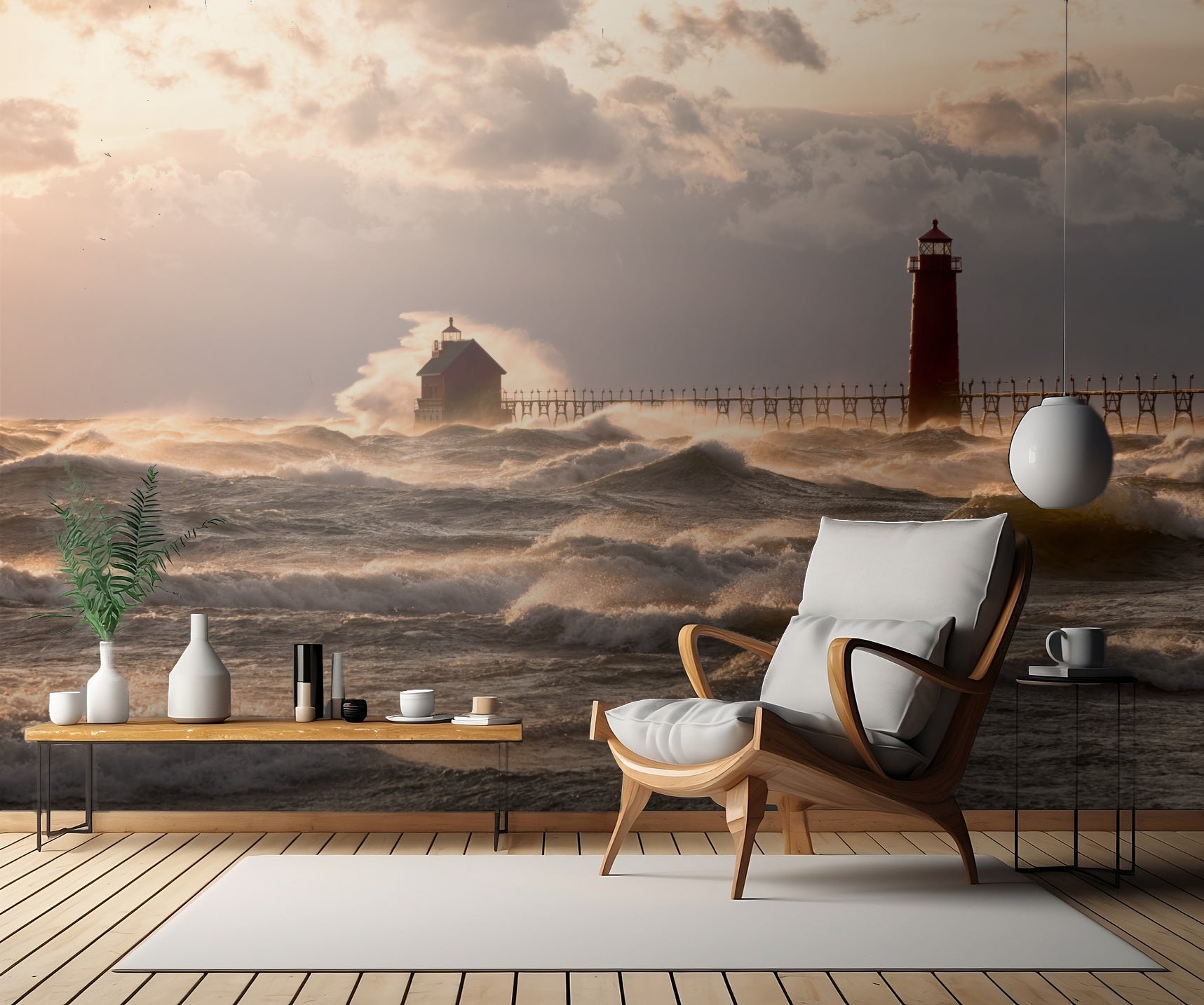 Blicka ut över horisonten och njut av den magnifika synen av en fyr som kastar sitt ljus över det stolta havet. Promenera nedför piren som sträcker sig ut över vattnets yta och ta in det friska luktande havsvattnet. Låt ditt öga vila på den vackra bryggan som binder samman land och hav på ett harmoniskt sätt.