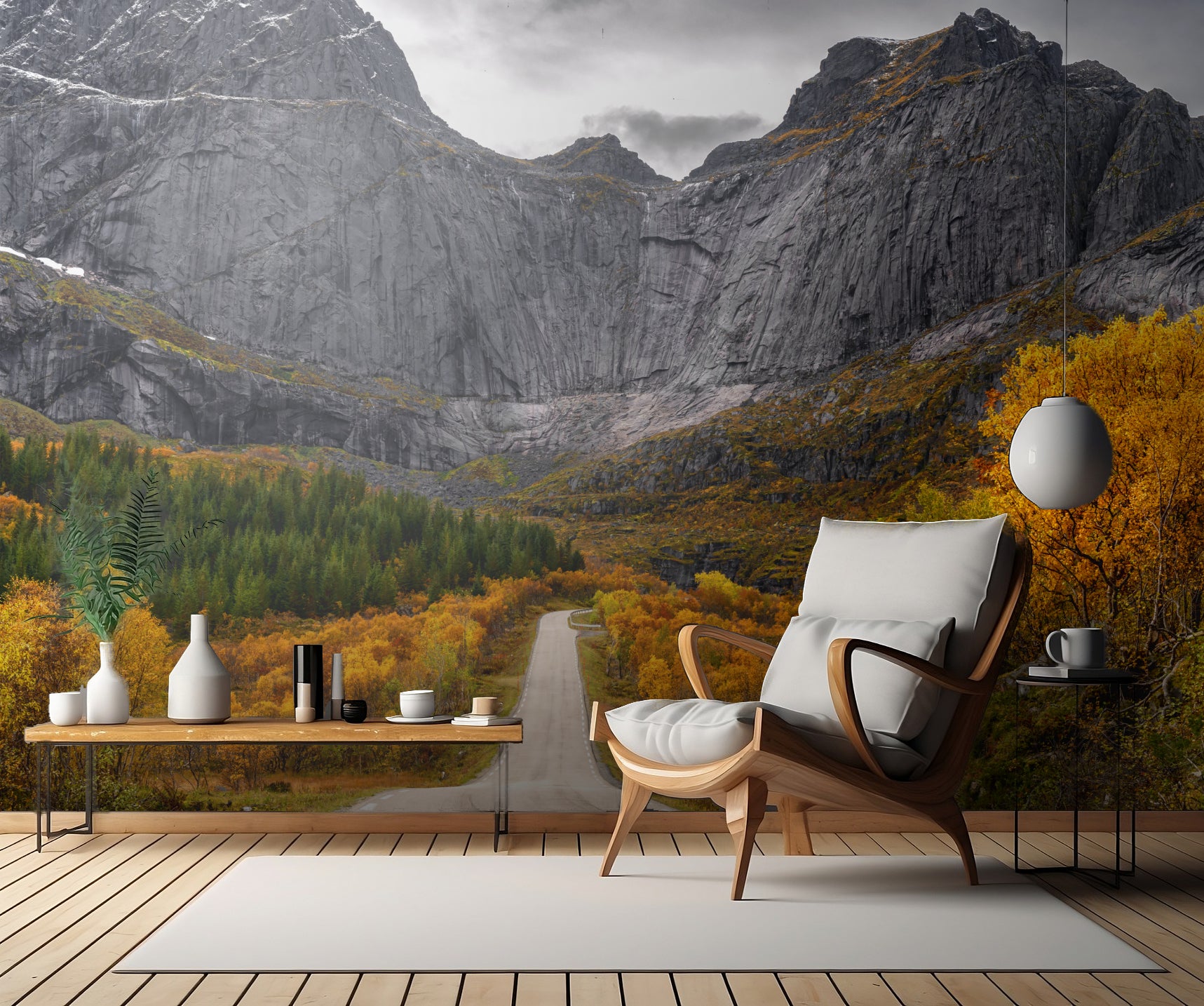 Med "Road to the Wall" får du en tapet som fångar den speciella stämningen av hösten i Norge. De gula och röda löven skapar en varm och inbjudande känsla, medan bergen och träden i fjärran ger en känsla av äventyr och upptäckt.