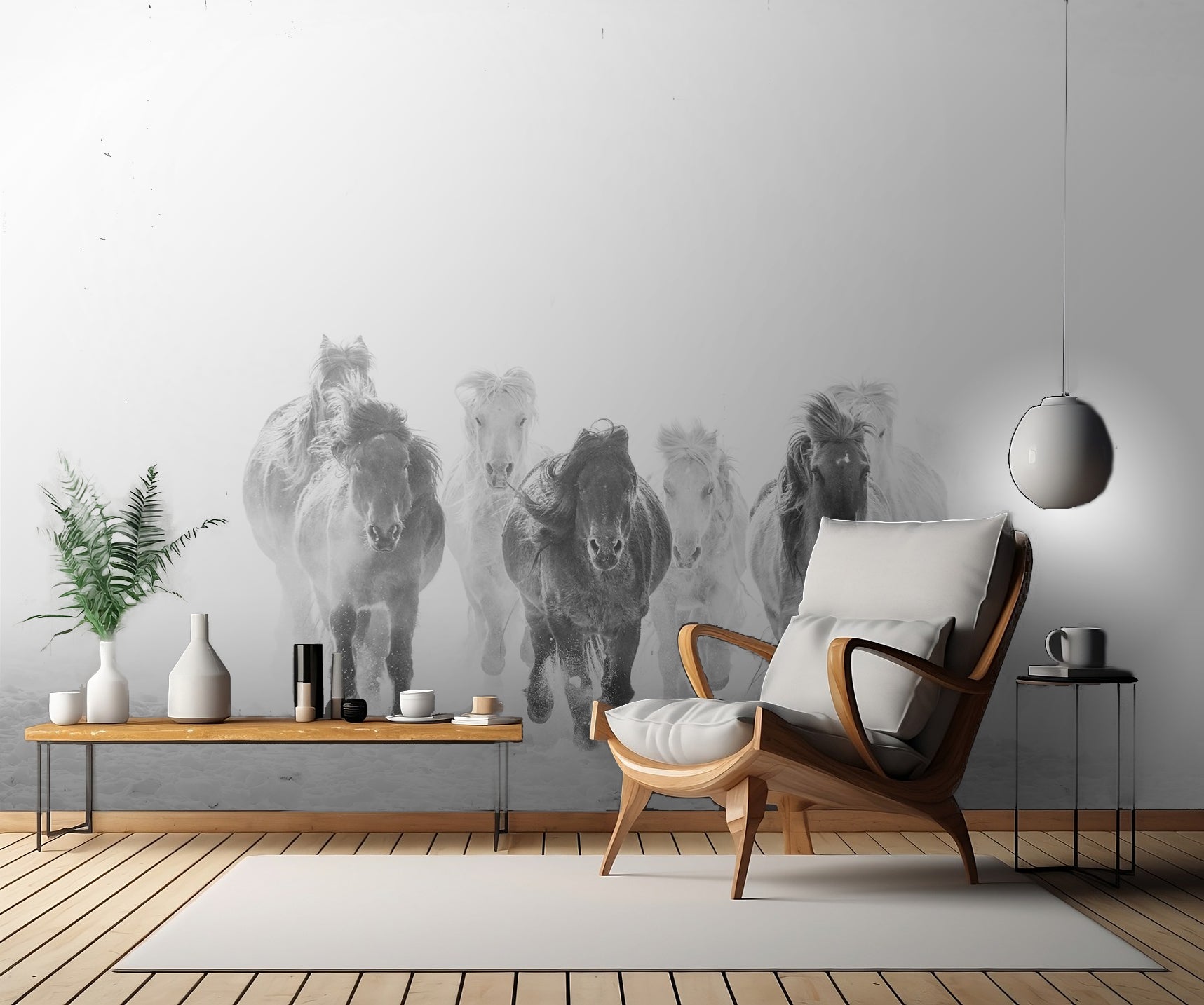 Ge ditt hem en touch av vintermagi med tapeten "Running in the snow" av den kreativa designern Bingo Z. Fånga ögonblicket när en flock hästar galopperar över en snötäckt mark i svartvitt. Med en enkel, vit bakgrund ger denna tapet en känsla av enkelhet och elegans till ditt rum. Den höga kontrasten i bilden skapar en dramatisk effekt som kommer att få din vägg att sticka ut. Låt denna vackra tapet föra in en känsla av rörelse och liv till ditt hem. Perfekt för alla som älskar djur och vackra landskap. Ge ditt rum ett unikt utseende med denna inspirerande tapet i det klassiska förhållandet 14. Vägg i vägg med naturen med "Running in the snow".