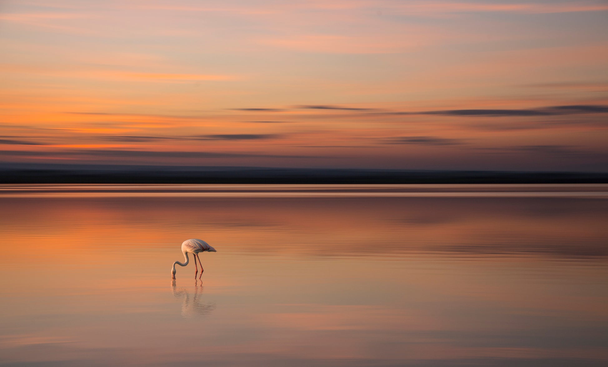 Den varma färgpaletten av orange och guld förstärker solnedgångens magiska skimmer, medan de rosa flamingorna ger en oväntad touch av elegans. Denna perfekta kombination av färger ger en känsla av skönhet och lugn som drar blicken till sig.
