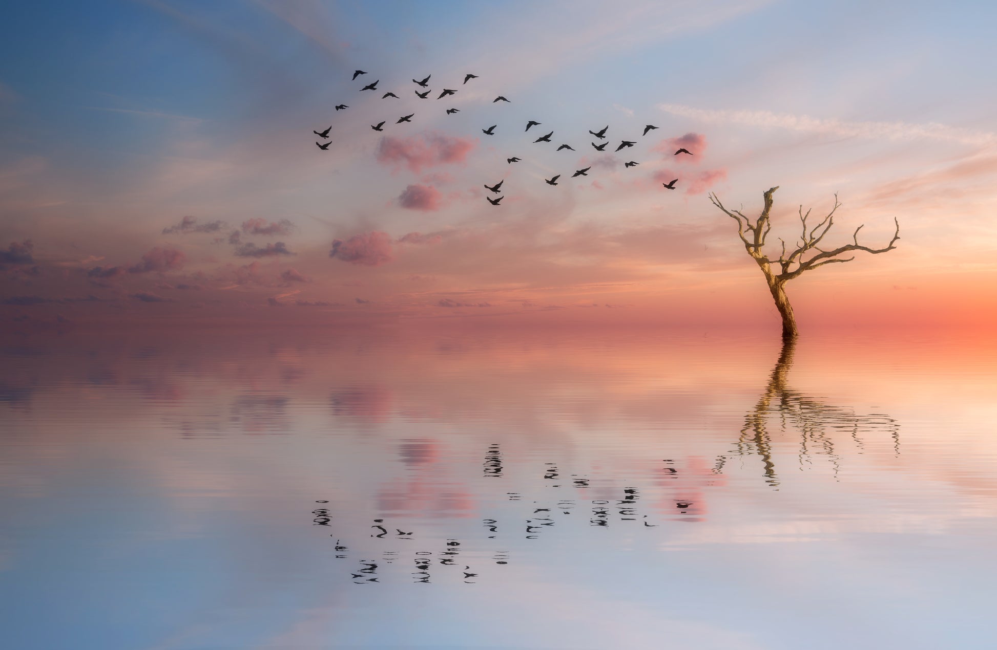 Sätt upp denna unika väggtapet och omringa dig med känslan av stillhet och skönhet. Tapeten visar trädet som står ensamt i horisonten, avbildat i en fantastisk spegling i vattnet. Det blir en bild som du kan drömma dig bort i, där tiden står stilla och du är omgiven av magin av en rosa solnedgång eller soluppgång.