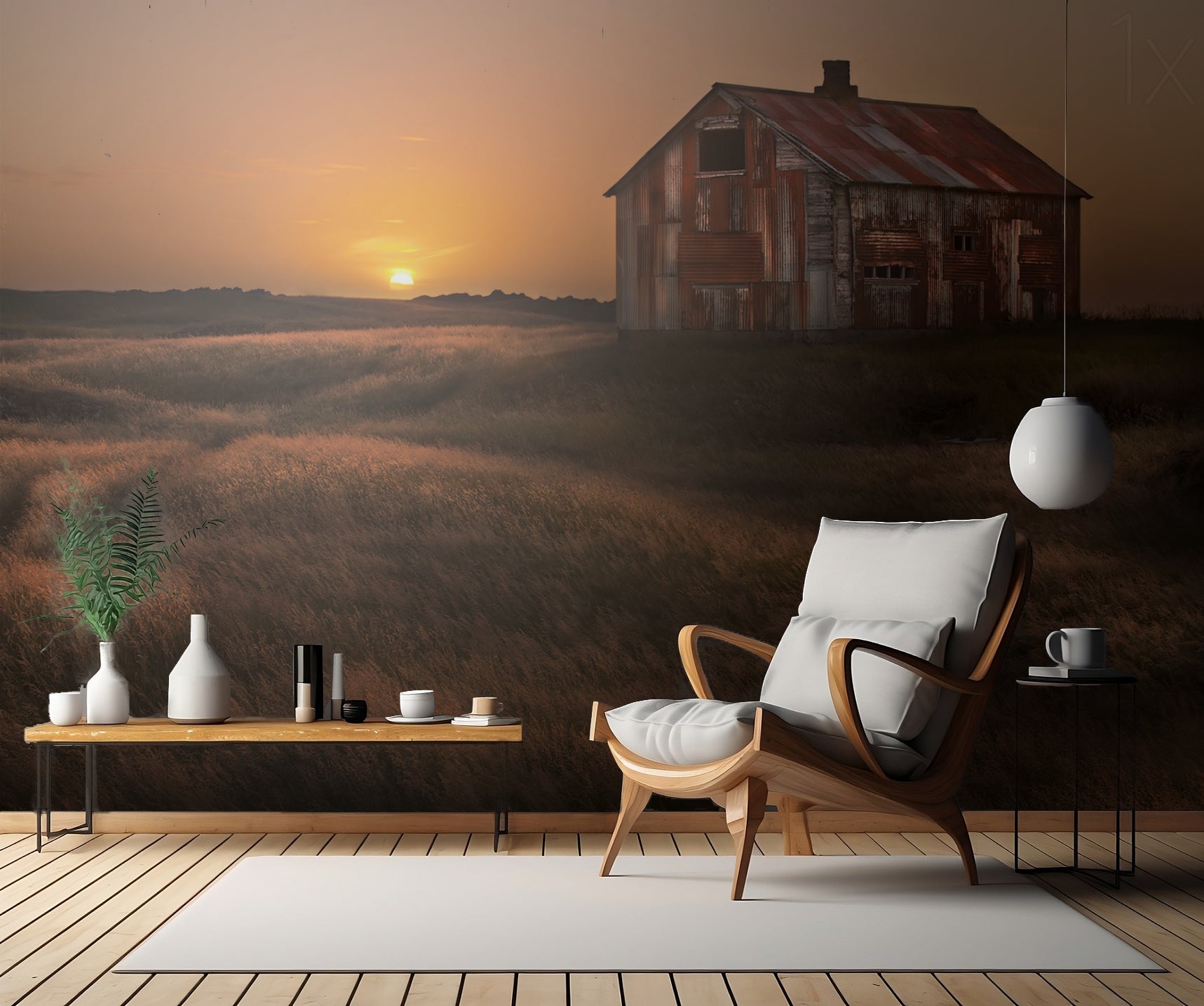 Den rostiga och förfallna skönheten i ett landsbygdslandskap fångas på ett hypnotiserande sätt i denna vykortsvärda tapet. Med solnedgången utmålad i varma toner och det övergivna huset som en sentimental bakgrund skapar tapeten en känsla av avskildhet och stillhet.
