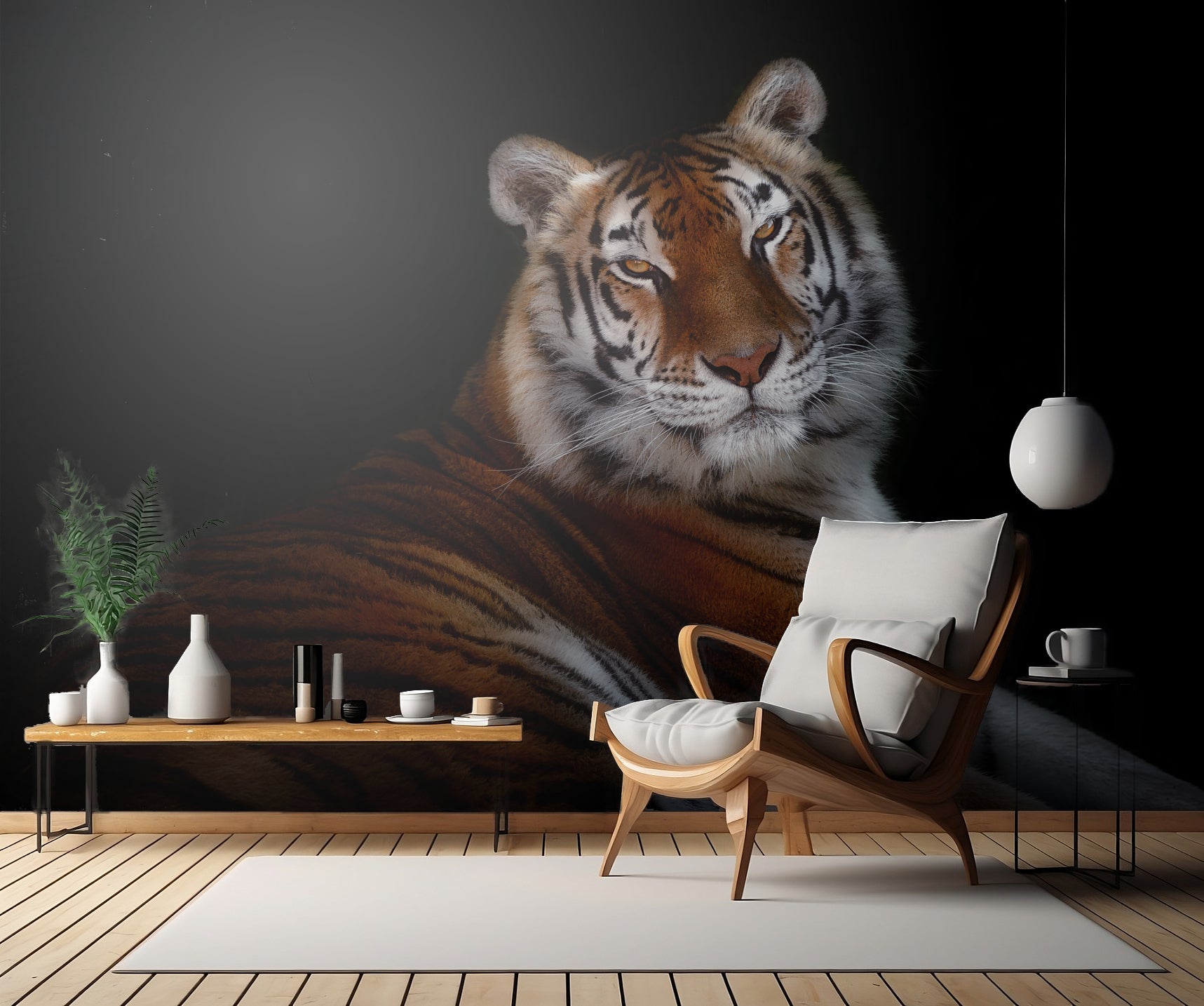 Denna tapet är en perfekt kombination av lågmäld sofistikation och en djärv sinnlighet. Dess lågmälda toner och enkla bakgrund tillåter tigern att bli stjärnan i rummet, samtidigt som den vilda naturens kraft ständigt påminner oss om världens skönhet och mångfald.