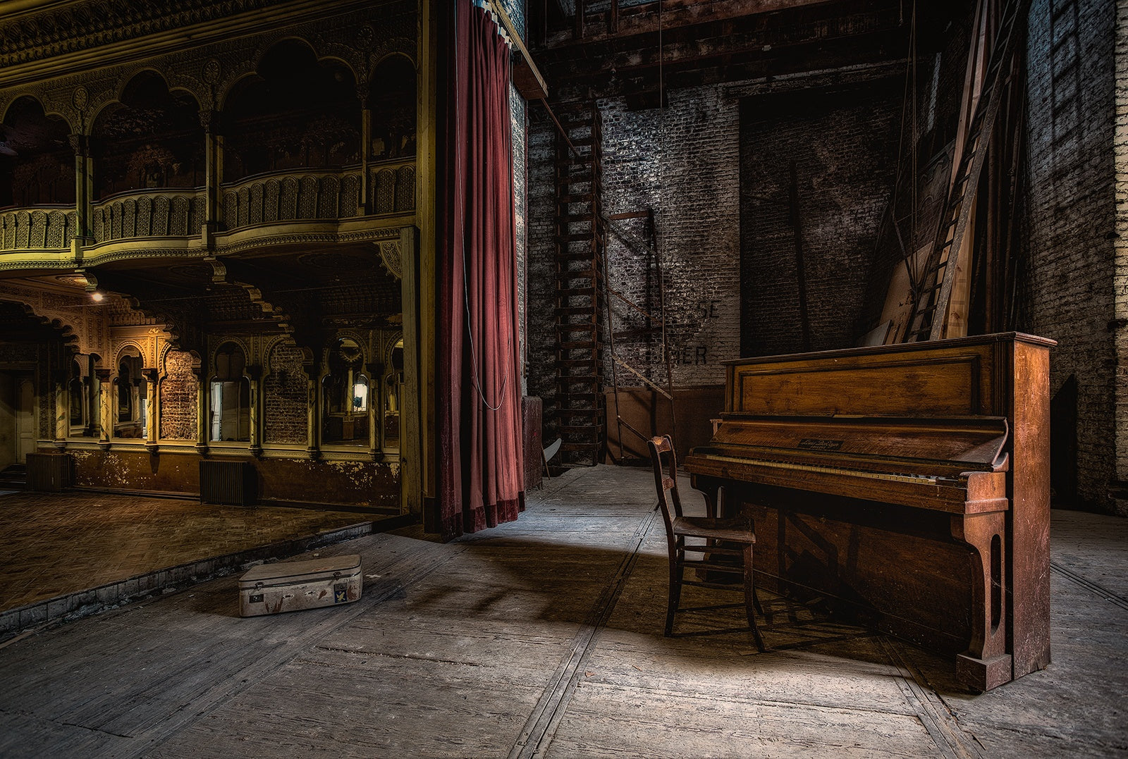 Show, interrupted" är en unik och fascinerande väggtapet skapad av Adrian Popan. Med motiv av förfallet piano, gamla draperier och slitna resväskor ger denna tapet en känsla av förlorad glans och bortglömd skönhet.