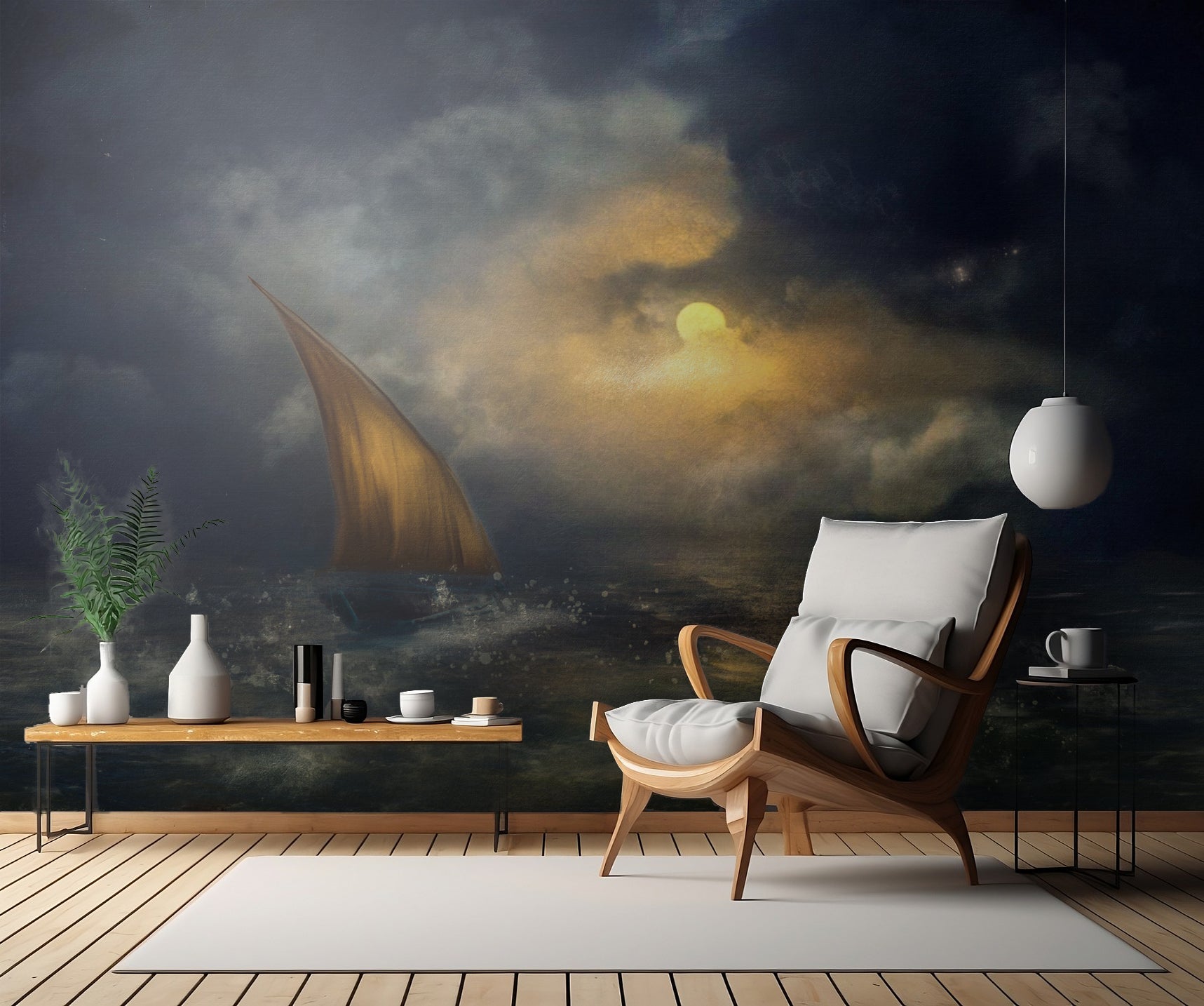 En segelbåt glider fram på vattnet, liksom symboliserar frihet och äventyr. Och precis som i en dröm, är båten både närvarande och svårfångad samtidigt. Tapetens vågiga mönster och molnens lekfulla formationer förstärker illusionen av ett gränslöst och outgrundligt hav.