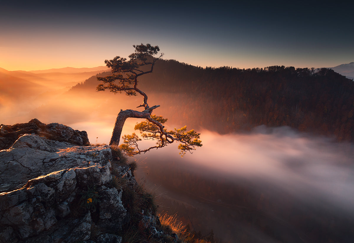 Upptäck ett magiskt landskap med vår vackra väggtapet "Sokolica", skapad av den talangfulla konstnären Karol Nienartowicz. Låt dig förtrollas av den enastående utsikten över ensamma bonsaiträd, bergstoppar och dimhöljda dalar som smälter samman i en sagolik solnedgång.