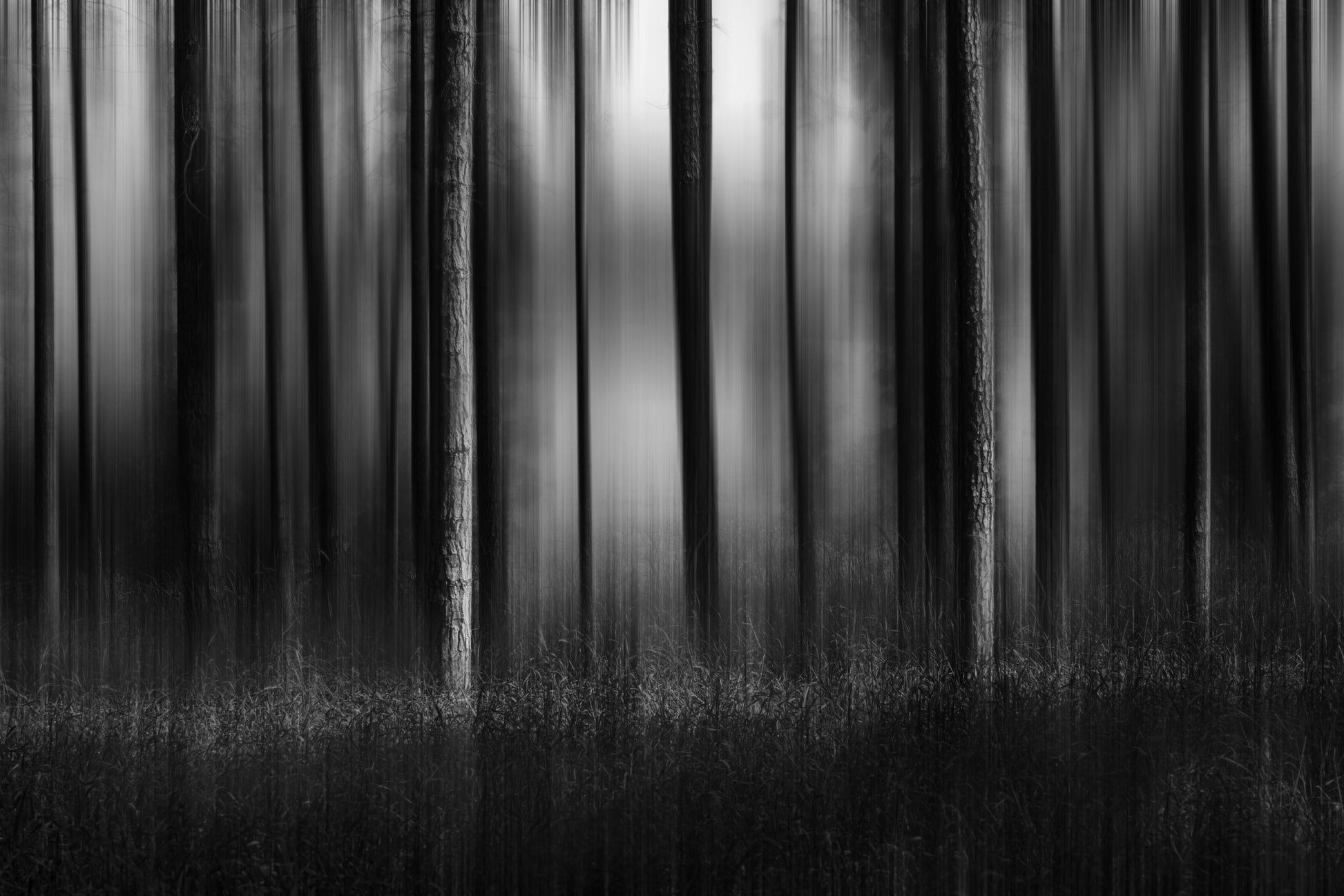 Med ett kreativt redigerat och suddigt mönster ger tapeten en känsla av rörelse och djup åt ditt rum. Blurriga streck och träd ger en illusion av att befinna sig mitt i en skog, med trädstammar som sträcker sig uppåt mot himlen.